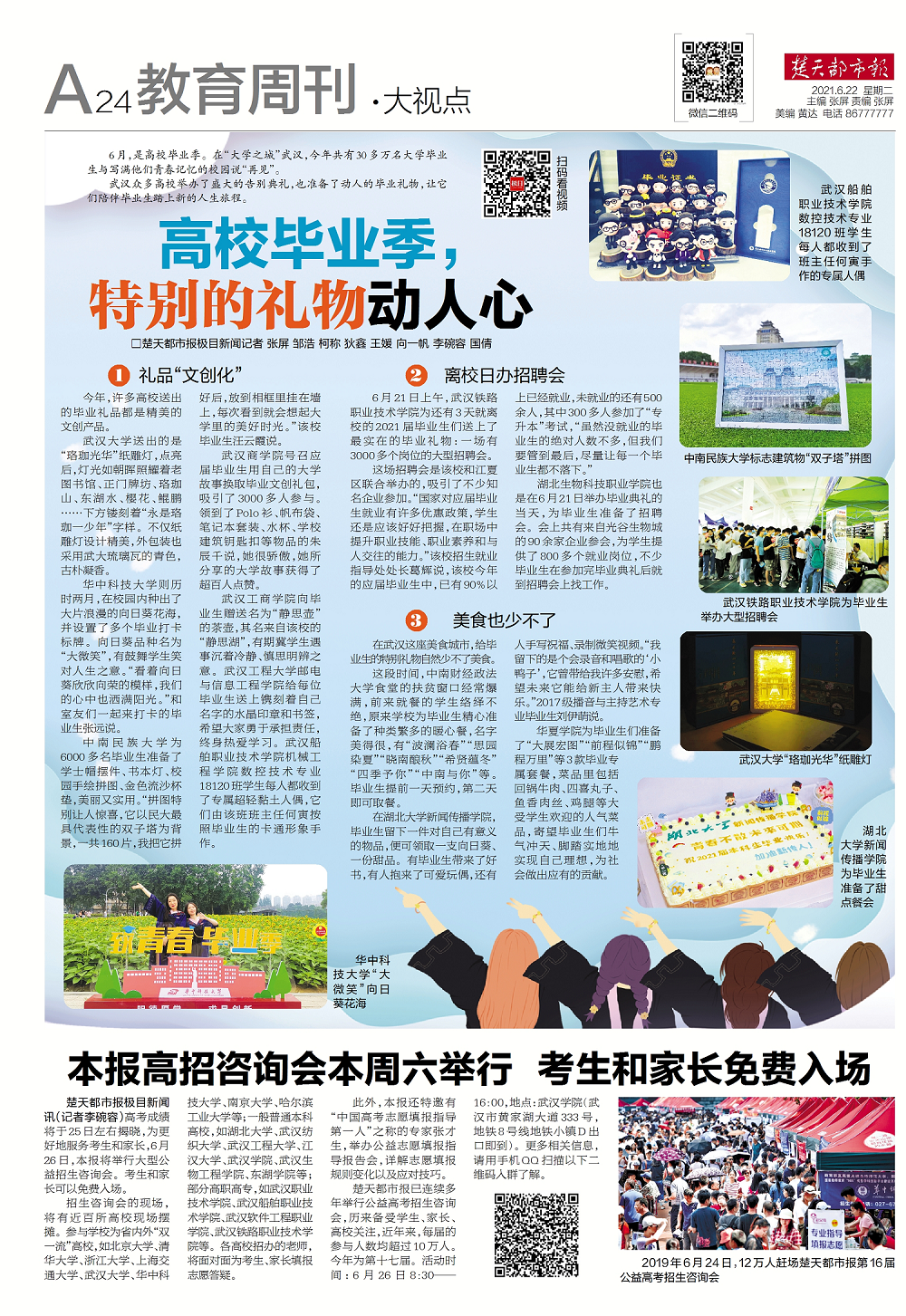 6月22日,楚天都市报24版教育周刊《高校毕业季,特别的礼物动人心》专版中,报道pg电子中国官方网站毕业季用故事换取文创礼物,获取学生一致好评。
