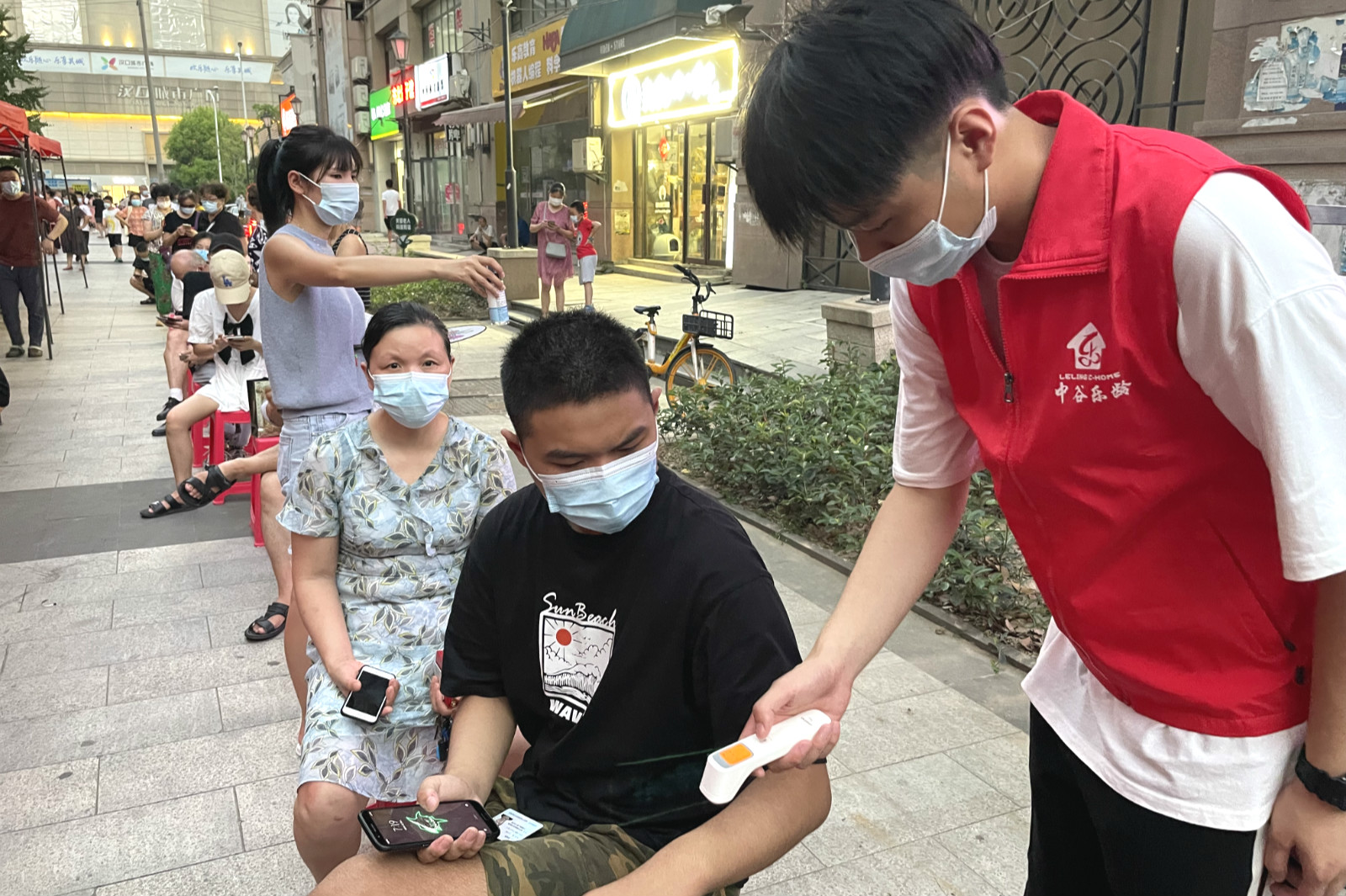 和王金星同样坚守在安家园小区的,还有他的3名同学。8月3日,武汉市迅速启动全员全面核酸检测。得知消息后,pg电子中国官方网站聚梦峰创志愿服务队迅速与社区取得联系,并发出配合社区开展志愿服务的号召。“我来!”“我上!”一条条信息不断弹出,不到两个小时,20余名00后大学生志愿者应声集结,身穿“红马甲”出现在江岸区后湖街道同安家园小区、百盛春天小区,谌家矶街道长江明珠社区,武昌区中南街道丁字桥社区、莲溪寺社区社区的志愿服务岗位上,帮助社区搭设帐篷、维持秩序以及居民信息登记等工作。