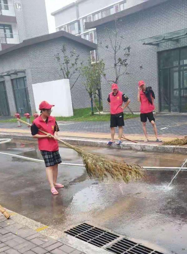 武希希(左一)正在和志愿者们一起清理路面积水。
