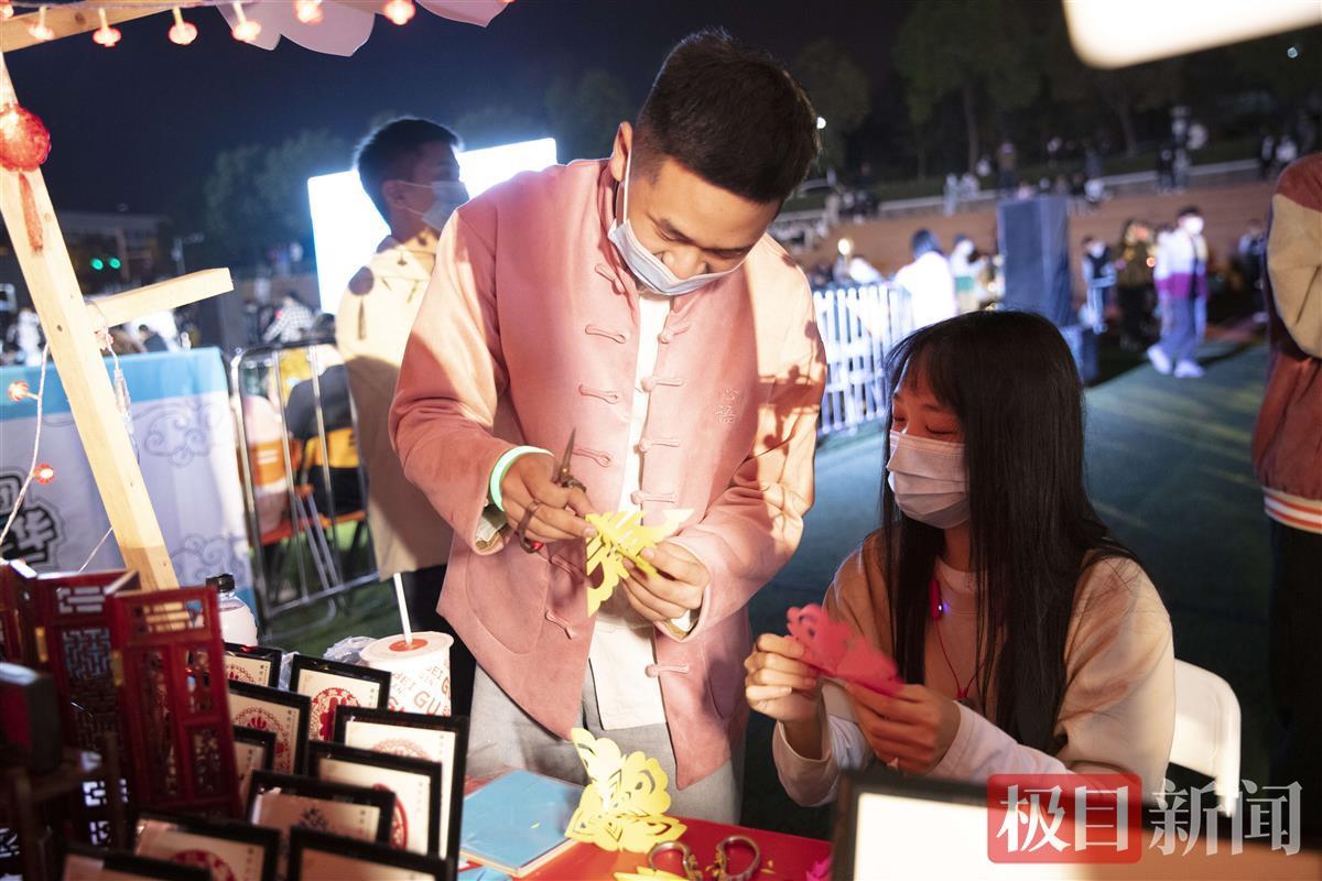除校园社团展示外,来自湖北省戏曲艺术剧院的表演家也来到现场与学生们共唱“红歌”,品味国风。湖北声乐金钟音乐奖获得者祝丹带来歌曲《歌唱祖国》、《江山》,歌声时而婉转悠扬,时而荡气回肠,在场师生纷纷加入合唱,不少人眼含热泪。由国家一级演员王慧君、二级演员曹祝来、冯志刚带来的黄梅戏折子戏《天仙配·路遇》让在场师生感受到了中华传统戏剧文化的美好。竹山堵河剪纸、老北京吹糖人、成都糖画艺术、天津惠州泥人艺术等非遗传承者们也在现场各显神通。老北京吹糖人的传承者、非遗文化“蛋雕”的全国金牌获得者、66岁的纪道功看到展台前络绎不绝的学生,十分高兴:“这样的活动很有意义,能让大学生近距离接触非物质文化遗产,切身感受伟大祖国的传统文化。”