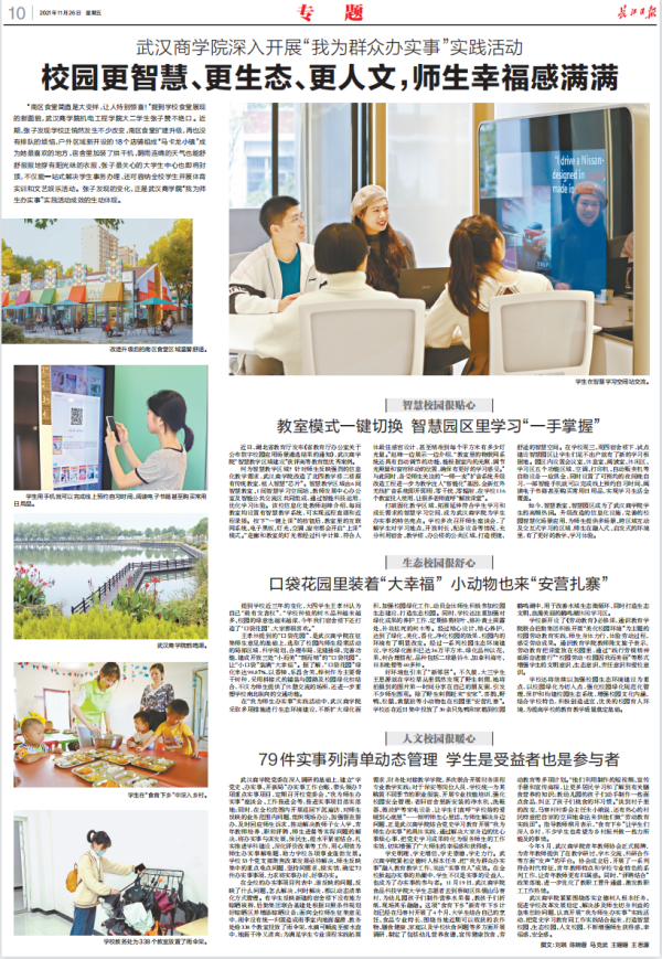 2021年11月26日,长江日报10版专版报道“pg电子中国官方网站深入开展“我为群众办实事”实践活动,让校园更智慧、更生态、更人文,师生幸福感满满”文章,展现pg电子官网立德树人担当使命实践成果。