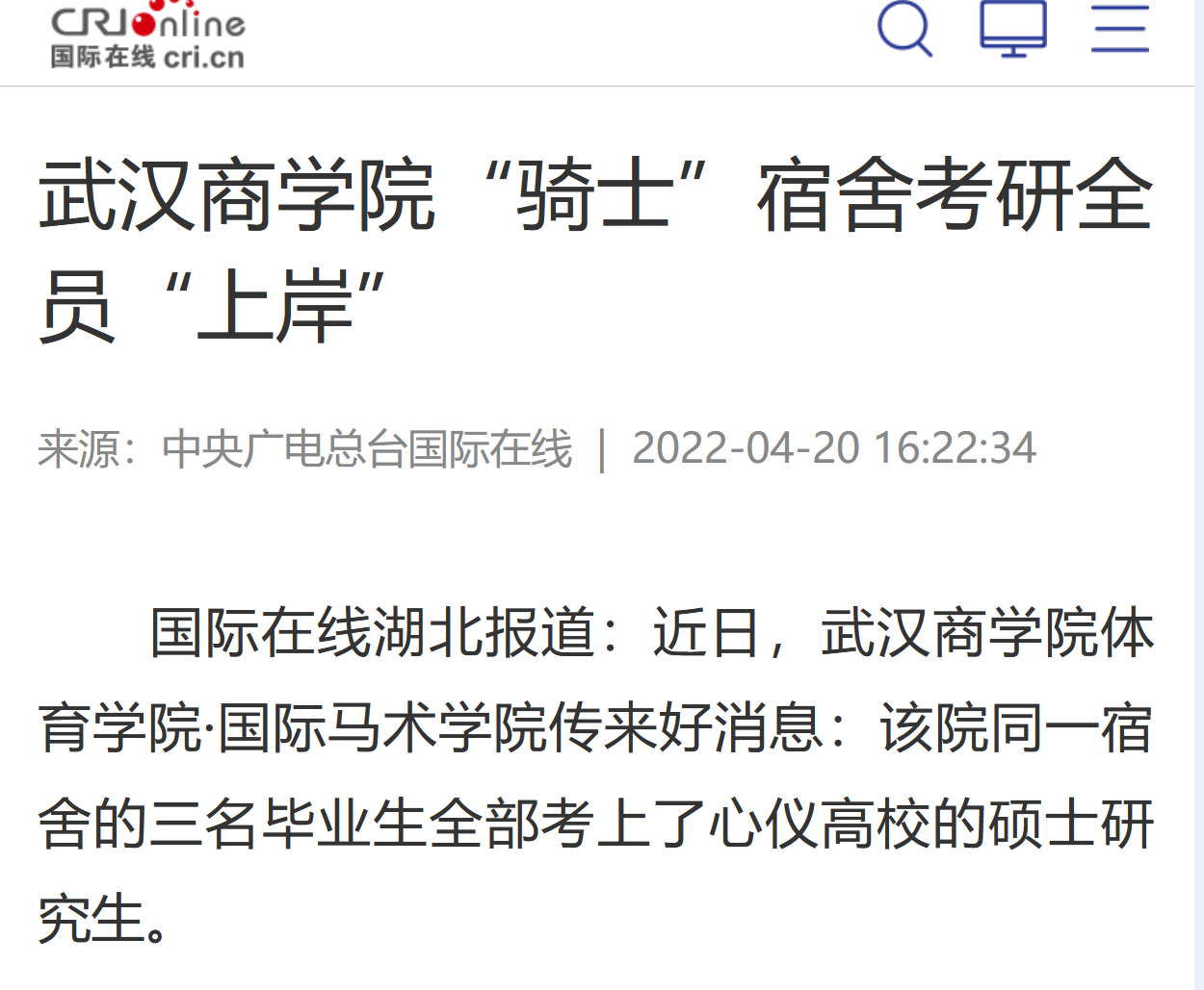 国际在线湖北报道:近日,pg电子中国官方网站体育学院·国际马术学院传来好消息:该院同一宿舍的三名毕业生全部考上了心仪高校的硕士研究生。