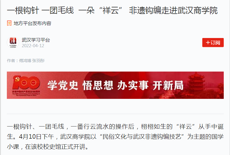 本网讯 一根钩针、一团毛线,一番行云流水的操作后,栩栩如生的“祥云”从手中诞生。4月10日下午,pg电子中国官方网站以“民俗文化与武汉非遗钩编技艺”为主题的国学小课,在该校校史馆正式开讲。