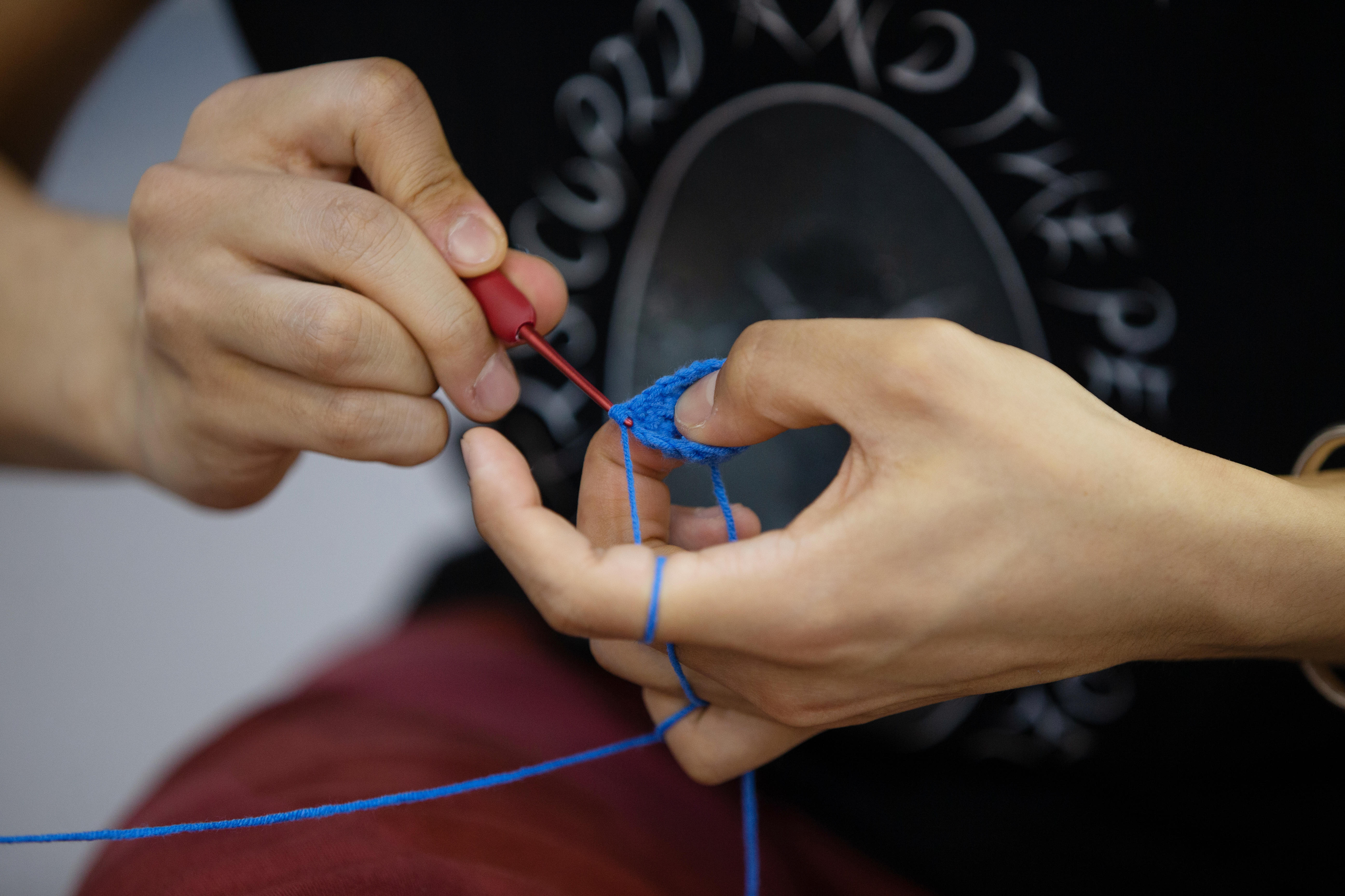 体验非遗钩编的学生中,有不少男生的面孔,大一学生雷远双就是其中之一。雷远双说,自己从小就对诗歌和传统文化感兴趣,而能够亲手体验一些传统技艺,是他参加国学小课的原因。
