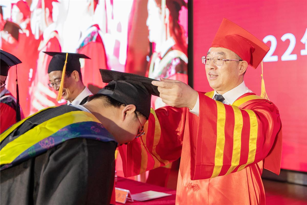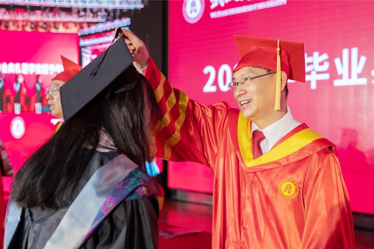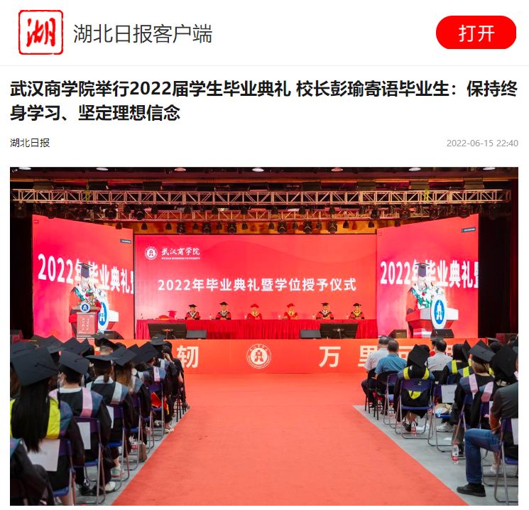 校长彭瑜寄语毕业生保持终身学习,书写青春新篇章。彭瑜说,宝剑锋从磨砺出,梅花香自苦寒来。2022届毕业生克服了疫情考验,圆满完成了学业,迈出校园走向更广阔的天地。彭瑜提出三点希望:一要终身学习,书写未来华章。毕业只是人生的转场,通过学习掌握的知识和技术是大家安身立命的武器和竞争力。读书的意义藏在你读过的每一本书里。读过的书在日积月累中通过记忆的沉淀,潜移默化地提升着大家的认知,滋润着大家的精神世界。二要心有所系,坚定理想信念。理想信念永远是照亮你们前行的明灯。毕业后,大家将奔赴祖国的大江南北,展现新一届武商院学子的风采,前进的道路不会一帆风顺,会有沟壑、坎坷和挑战,希望大家不忘初心、永葆信念,踔厉奋发、笃行不殆,将苦难变成财富。三是奋楫争先,青春勇在担当。当代中国青年是与新时代同向同行、共同前进的一代,实现中华民族伟大复兴的中国梦,需要一代一代青年的矢志奋斗。大家生逢盛世,肩负重任,要到祖国最需要的地方去经历风雨、历练成长,让青春之花绚丽绽放,在新时代新征程上,以新的作为书写新的篇章。