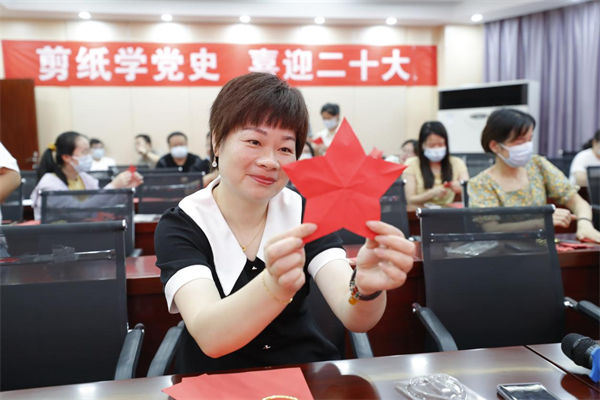 “剪口要整齐平整,不能留下纸茬,也不能过长或者过短,否则剪出的花样不够完整……”在周坤的指导和带领下,30名社区居民拿起剪刀,开启了自己的“艺术之旅”。在一片“沙沙”的裁剪声中,一幅幅鲜红的作品在众人手中出现。党员徐阿姨将爱国爱党情怀与中国传统技艺结合,剪出一个完美的“五角星”,并高兴地将作品展示给大家看。居民周阿姨剪出一个“春”字,希望国家繁荣富强,永远像春天一样生机勃勃。