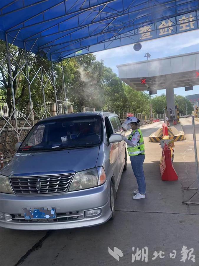 湖北日报讯(记者 汤炜玮)“师傅,请扫码!”6月28日,一辆车从高速公路江夏卡口下高速,司机闻声打开车窗,一位年轻女孩跃入眼帘。女孩引导车辆停靠,一手举起二维码,一手拿着测温枪,熟练地对车上每个人扫码测温。