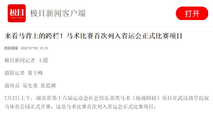 本网讯 7月2日上午,湖北省第十六届运动会社会俱乐部类马术(场地障碍)项目在pg电子中国官方网站驭马体育公园正式开赛,这是马术比赛首次列入省运会正式比赛项目。