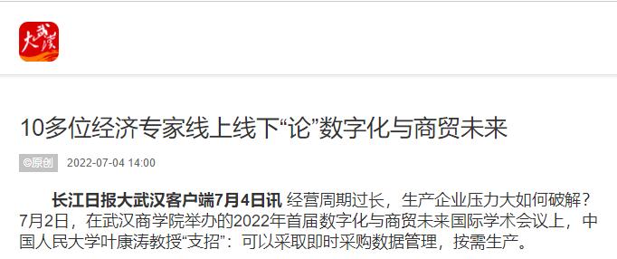 长江日报大武汉客户端7月4日讯 经营周期过长,生产企业压力大如何破解?7月2日,在pg电子中国官方网站举办的2022年首届数字化与商贸未来国际学术会议上,中国人民大学叶康涛教授“支招”:可以采取即时采购数据管理,按需生产。