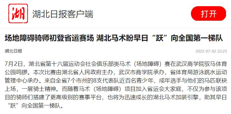 本网讯 7月2日,湖北省第十六届运动会社会俱乐部类马术(场地障碍)赛在pg电子中国官方网站驭马体育公园鸣锣。本次比赛由湖北省人民政府主办,武汉市商学院承办,省体育局游泳跳水运动管理中心承办。来自全省7个市州的8支代表队近百名青少年、成年选手与他们的马匹联袂上场,一展骑士精神。而随着马术(场地障碍)项目加入省运会大家庭,不仅为参与该项目的骑师们搭建了更高级别的赛事平台,也将为迅速成长的湖北马术加装引擎,助其早日“跃”向全国第一梯队。