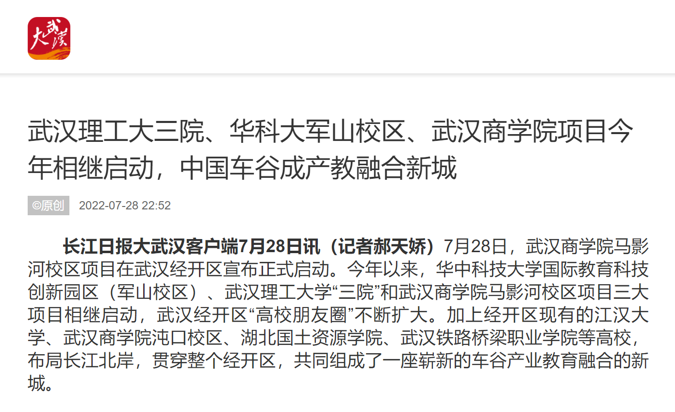 为何今年三所大学接连在武汉经开区启动新校区建设?武汉经开区是国内汽车产业集聚度最高的区域,在不到500平方公里范围内,集聚10余家整车厂,500余家知名零部件企业,年产整车近百万辆,工业产值超3200亿元,被称为“中国车谷”。前身之一为武汉汽车工业大学的武汉理工大学,具有汽车工业相关学科优势,其布局的“研究院”正好紧密对接新能源汽车、人工智能等热门领域。
