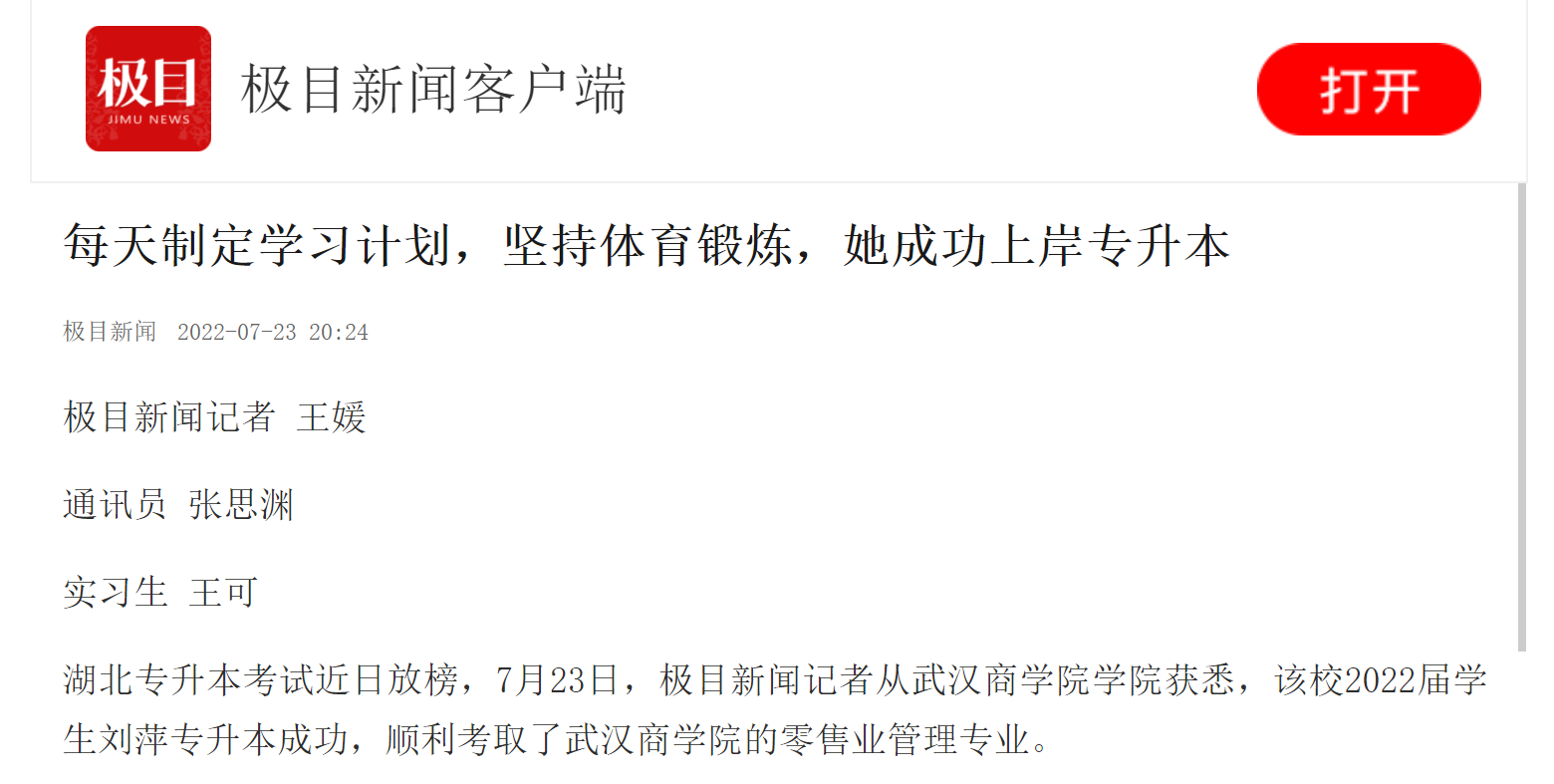 湖北专升本考试近日放榜,7月23日,极目新闻记者从pg电子中国官方网站学院获悉,该校2022届学生刘萍专升本成功,顺利考取了pg电子中国官方网站的零售业管理专业。