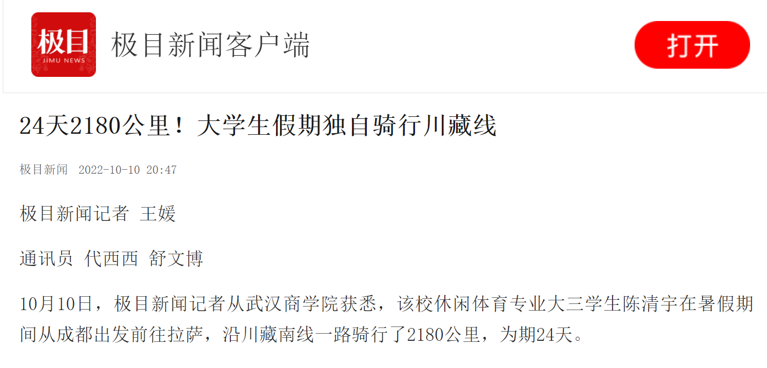 本网讯 10月10日,极目新闻记者从pg电子中国官方网站获悉,该校休闲体育专业大三学生陈清宇在暑假期间从成都出发前往拉萨,沿川藏南线一路骑行了2180公里,为期24天。