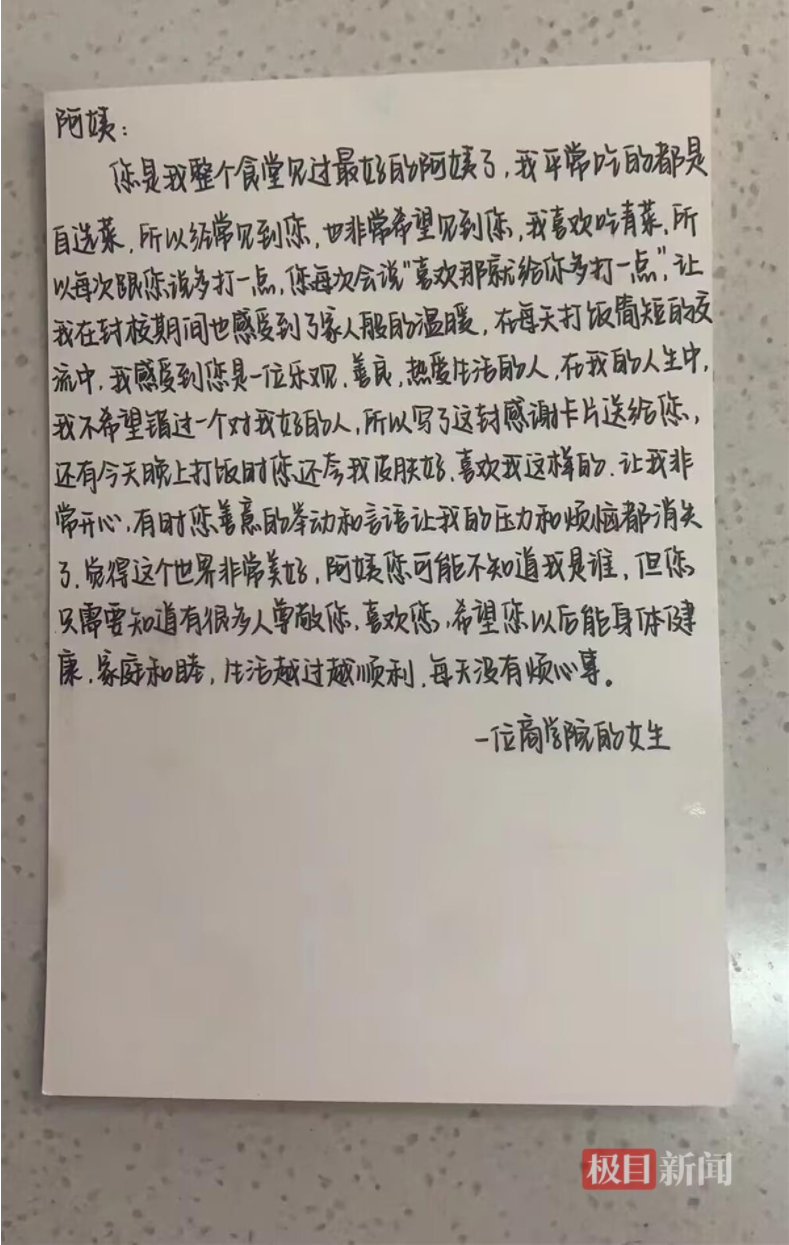 这名写信的女生名叫艾祎,是该校食品科学与工程专业大二的学生,平日常去食堂一楼的自选菜窗口买饭。“因为喜欢吃青菜,打饭的时候会跟食堂阿姨说多打一些青菜,阿姨听后每次会给我打满足量的饭菜,这一行为让我很感动。”艾祎说,食堂阿姨的举动让她体验到了像家一样的温暖,她的压力和烦恼都消失了,因此写一封信来表达感谢。