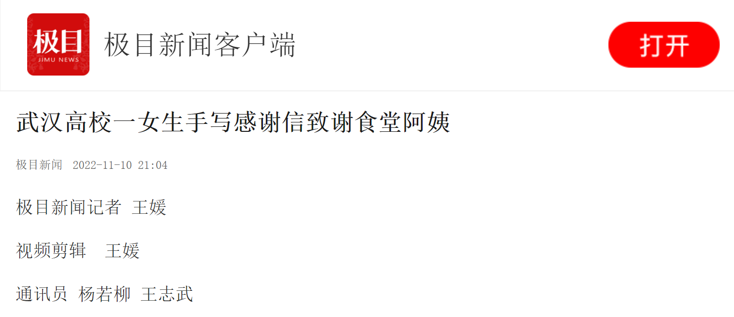 “看到这封信的时候,我瞬间忘记了一天的劳累,当时非常开心,看了一半眼眶就湿润了。很感谢有人能看到我们的工作,希望能找到这名学生,我也想当面感谢她。”潘金花说,她还收到了食堂经理奖励的800元现金,在以后的工作中要用真心和微笑面对用餐人员。