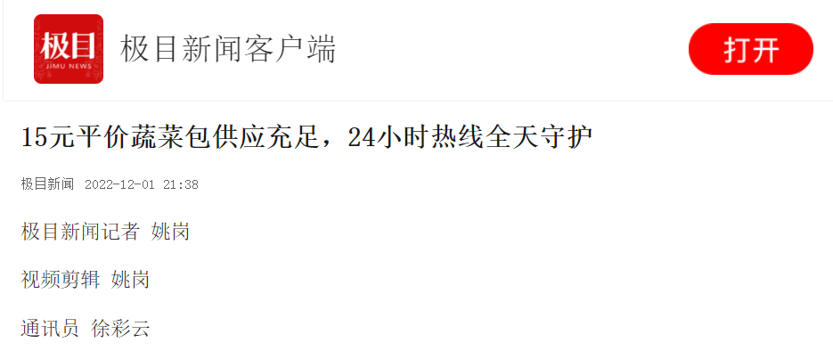 12月1日,武汉经开区薛峰社区的居民李先生告诉极目新闻记者,他目前是居家线上办公状态。“我花了15元购买了社区组织的蔬菜包,里面有西兰花、莴笋等5种蔬菜,有10多斤重,听说是街道进行了价格补贴,还是很实惠的。另外,我还可以在线上平台买肉、日用品等物资,在小区指定位置取货。”李先生说。