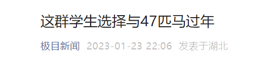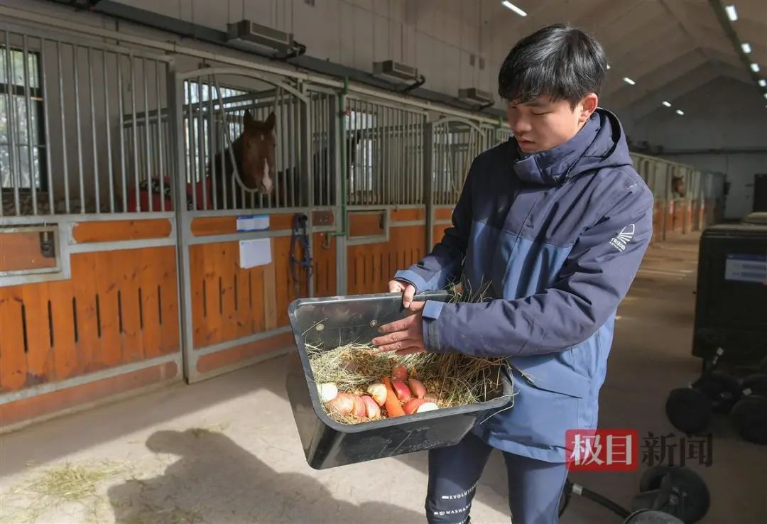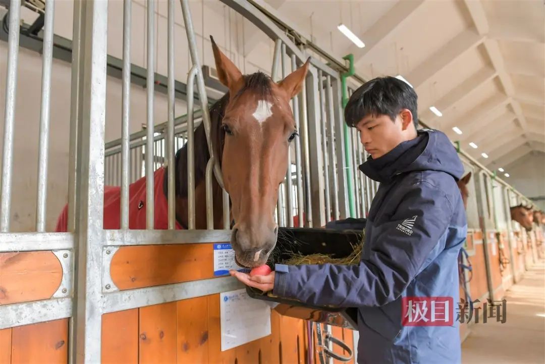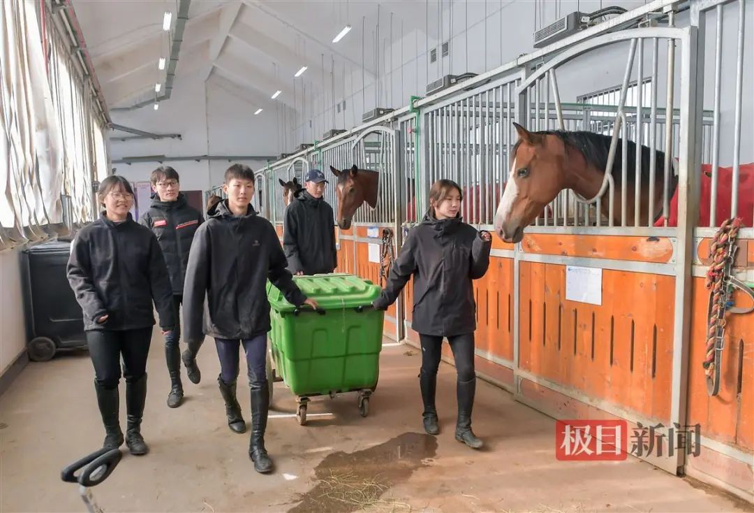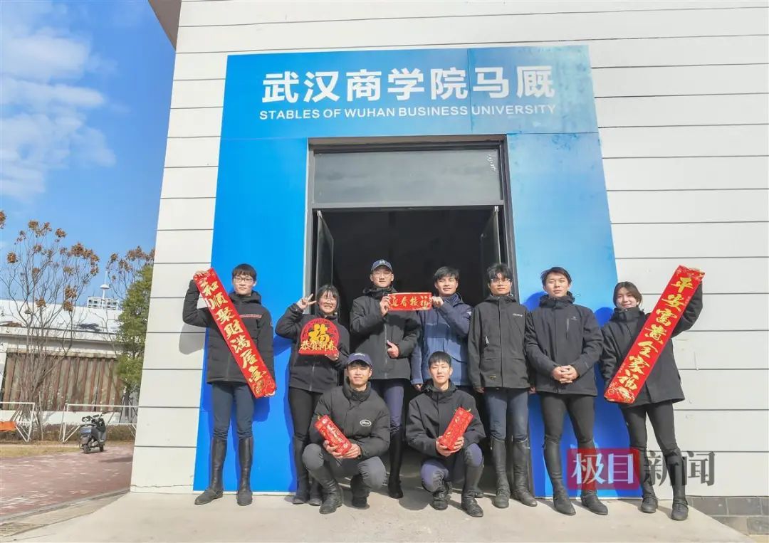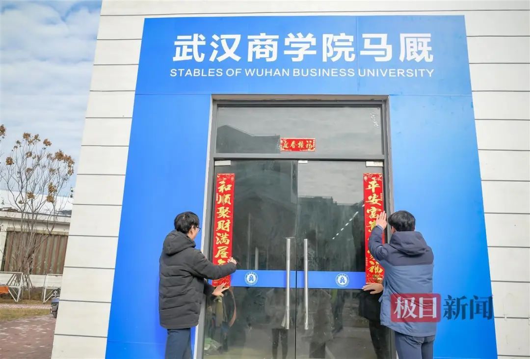 极目新闻记者在现场看到,留校的9名学生正忙着清扫马厩,贴春联,给马儿穿新衣,精心制作马儿专属团年饭,陪马房里的47匹马过农历新年。