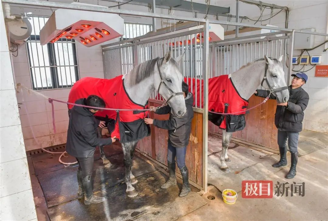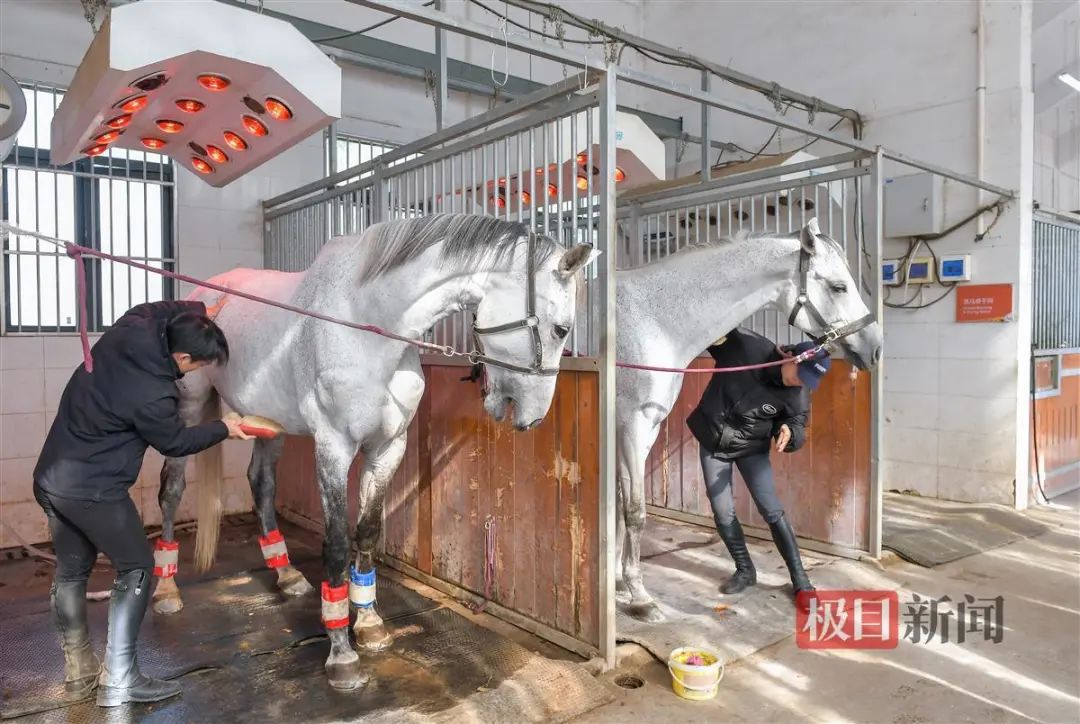 踏入马房,浓浓的年味随着春联、福字、红气球等节日装饰扑面而来。名为长胜、楚风的马儿刚做完spa按摩,在灯下进行烘干,穿上了红色新衣。