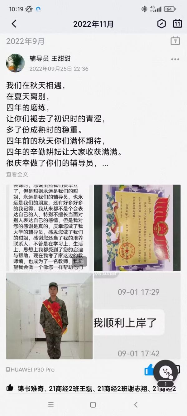 在王甜甜的相册里,还存了不少学生的留言截图。“甜姐!我顺利考上教师编了。”2022年9月,毕业生张雅东考上家乡湖北天门的教师岗位,向王甜甜传来喜报。“想像甜姐一样,做一个帮助学生学习、关心学生生活、还能和学生做朋友的老师。”张雅东说。和王甜甜四年来的相处对她触动很大,张雅东对自己的就业期望进行了很多反思与调整,最终她选择同王甜甜一样,做一名教师,并顺利考入家乡初中任教。“我的老师对我好,我也要对学生好。”在王甜甜的影响下,她带过的学生有不少都走上了教师岗位,这让王甜甜真切地感受到学生工作的价值与意义。