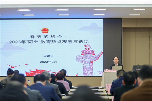 周洪宇在报告中介绍了2023年全国两会概况、十三届全国人大常委会五年工作成就与立法法修订、政府工作报告主要精神、教育热点观察与思考等内容。
