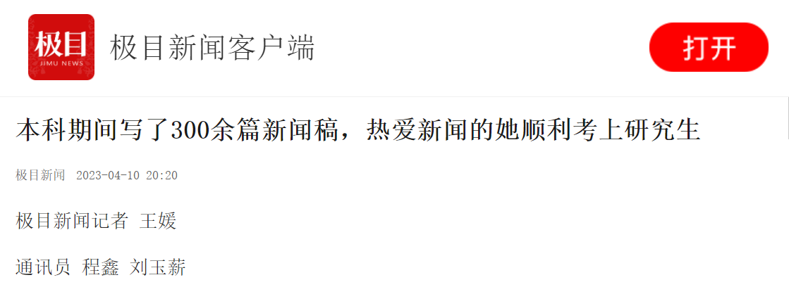 虽然很辛苦,陈婉蓉表示,自己过得很开心。“我认识了很多不同的人,听了许许多多的故事,还成为它们的记录者,这样的事情本身就很有意义。”从采访过程中获取了丰富的经验,也让陈婉蓉坚定了“转行”的想法,2022年4月,陈婉蓉正式确定报名新闻与传播研究生考试。