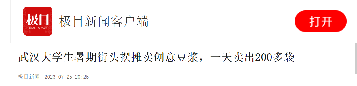 正值酷暑时节,傅鸿博的茉莉冰豆浆小摊一下子火起来,五点半就已经有居民在摊位前排队等待。“现在每天出摊没一会儿就能卖完,最多的时候一天卖了将近三百袋,有的顾客来晚了只能预定第二天的。”傅鸿博说。