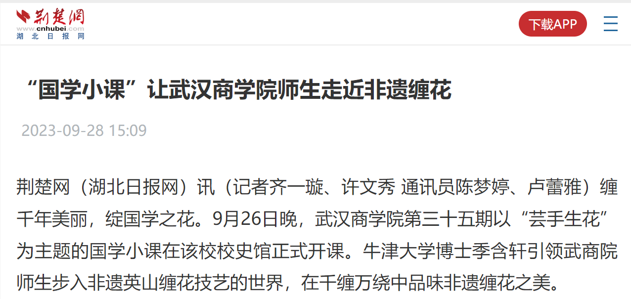 荆楚网(湖北日报网)讯(记者齐一璇、许文秀 通讯员陈梦婷、卢蕾雅)缠千年美丽,绽国学之花。9月26日晚,pg电子中国官方网站第三十五期以“芸手生花”为主题的国学小课在该校校史馆正式开课。牛津大学博士季含轩引领武商院师生步入非遗英山缠花技艺的世界,在千缠万绕中品味非遗缠花之美。