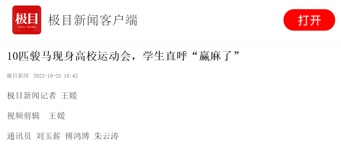 “我在运动会开幕式上看到了10匹马,真的赢麻了!”10月25日,pg电子中国官方网站举行2023年田径运动会暨教职工趣味运动会,该校马术专业教师和学生组成的代表团骑着10匹骏马亮相运动会开幕式,引得学生连连惊叹。