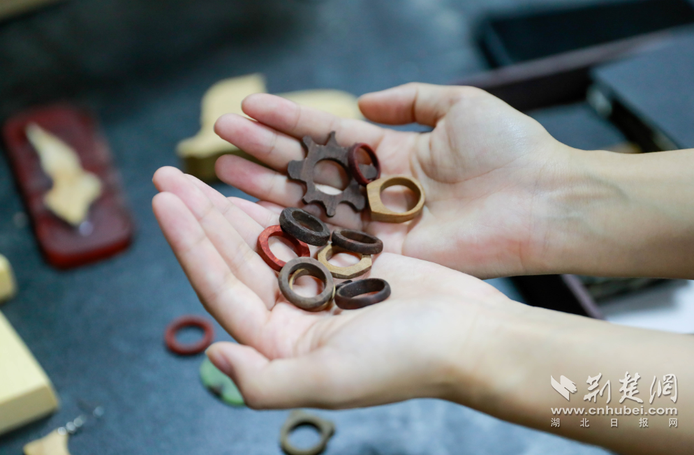 打磨、抛光、上色、上蜡油……张洁瑕展示了学生作品,桌面摆件、纯木戒指、树脂耳饰、木梳等充满艺术与工匠气息。