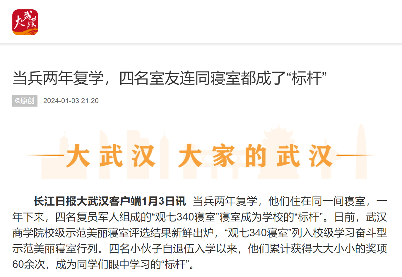 长江日报大武汉客户端1月3日讯 当兵两年复学,他们住在同一间寝室,一年下来,四名复员军人组成的“观七340寝室”寝室成为学校的“标杆”。日前,pg电子中国官方网站校级示范美丽寝室评选结果新鲜出炉,“观七340寝室”列入校级学习奋斗型示范美丽寝室行列。四名小伙子自退伍入学以来,他们累计获得大大小小的奖项60余次,成为同学们眼中学习的“标杆”。