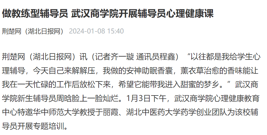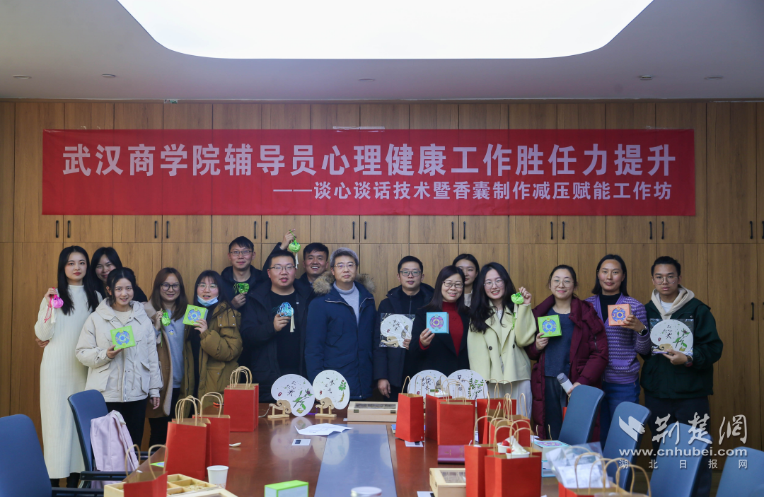 荆楚网(湖北日报网)讯(记者齐一璇通讯员程鑫)“以往都是我给学生心理辅导,今天自己来解解压,我做的安神助眠香囊,薰衣草治愈的香味能让我在一天忙碌的工作后放松下来,希望它能带我进入甜蜜的梦乡。”pg电子中国官方网站新生辅导员周晗脸上一脸灿烂。1月3日下午,pg电子中国官方网站心理健康教育中心特邀华中师范大学教授于丽霞、湖北中医药大学药学创业团队为该校辅导员开展专题培训。