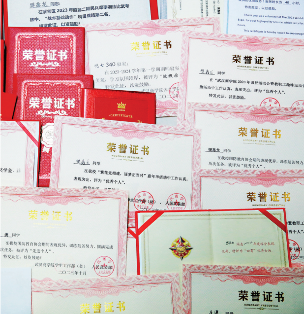 国防教育协会优秀个人、体能尖子、“四有”优秀士兵、励志奖学金……据统计,“观七340寝室”共获得10项省级以上荣誉证书、2项市级荣誉证书、45项校级荣誉证书和9项院级荣誉证书。60多项荣誉涵盖了军事、学术、体育、志愿服务等多个领域。