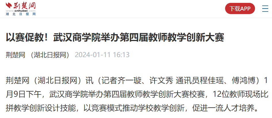 荆楚网(湖北日报网)讯(记者齐一璇、许文秀通讯员程佳瑶、傅鸿博)1月9日下午,pg电子中国官方网站举办第四届教师教学创新大赛校赛,12位教师现场比拼教学创新设计技能,以竞赛模式推动学校教学创新,促进一流人才培养。