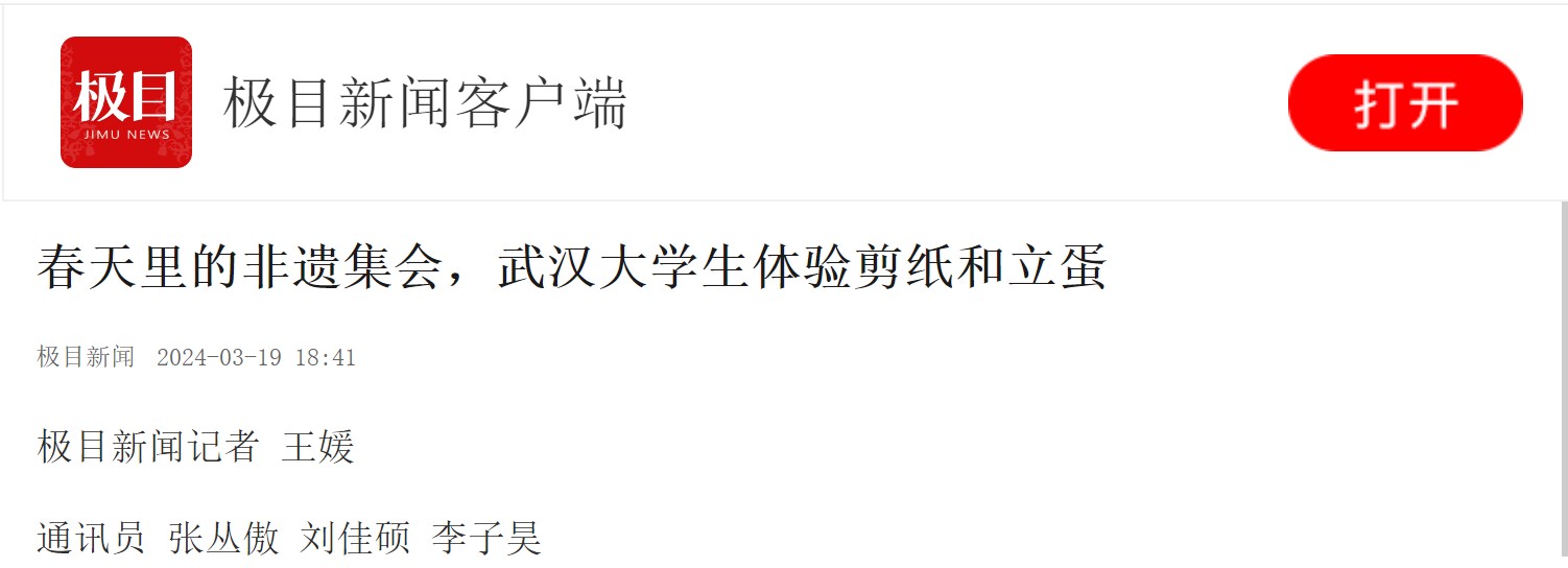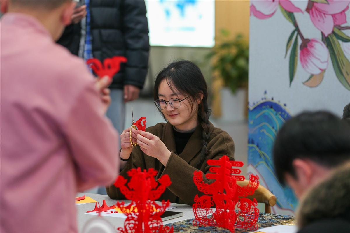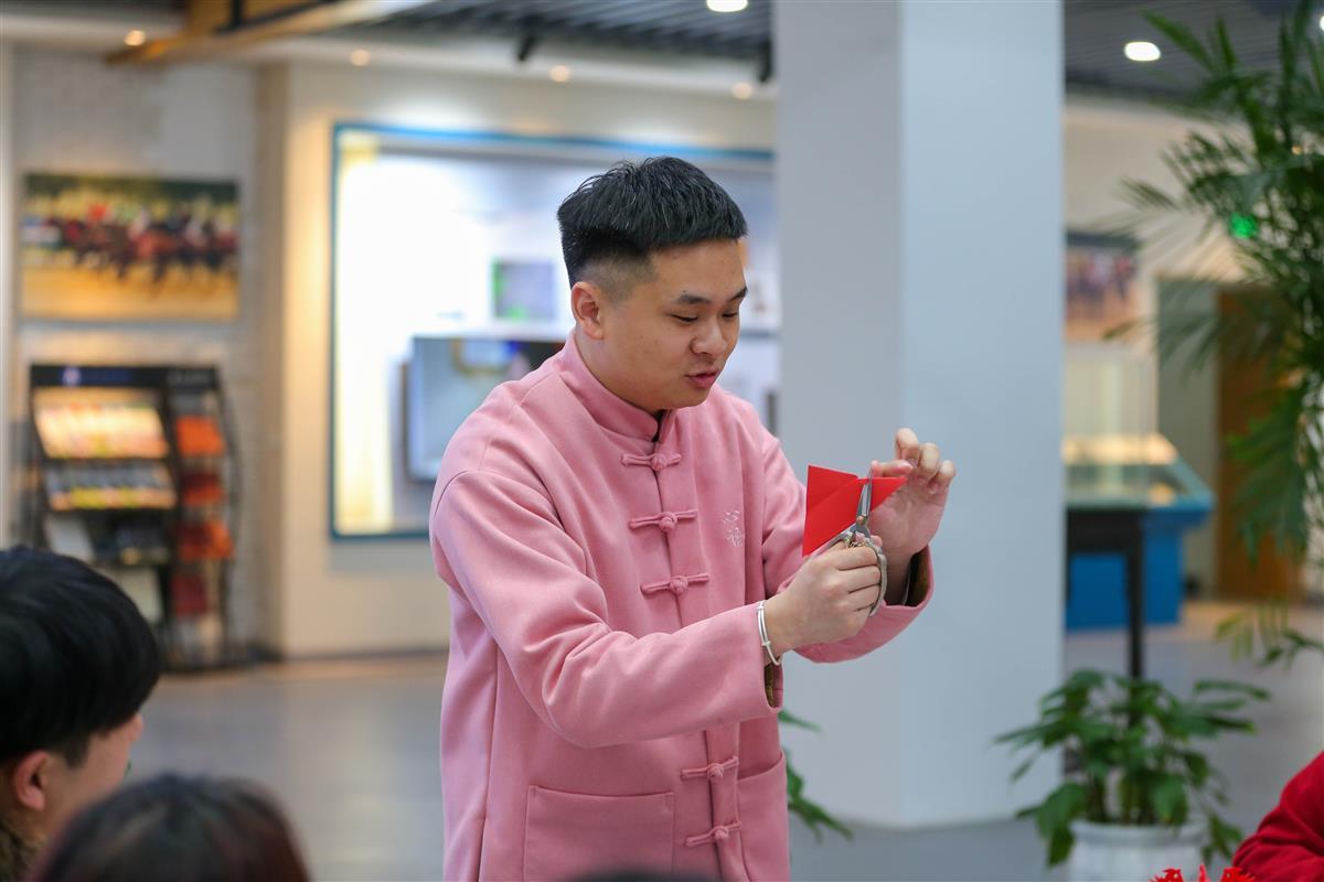 与此同时,春分立蛋、非遗剪纸活动也进行得如火如荼。红纸、巧手,几下翻飞之后,略微拼折,一个“中国结”与一个“春”字便成形。折剪中国结时,堵河剪纸传承人周坤边折边讲:“大家看这条线上要保持基本垂直的状态,代表着播种希望。顺着这条线往下再往前又剪一段,再绕个圆弧,就像太阳的形状,寓意着生活美满。”活动现场,学生们积极配合,不亦乐乎。2023级艺术学院服装与服饰设计三班张恬表示,一把剪刀和一双巧手,就能让一张普通的红纸变换这么多美妙的样式,剪纸艺术,令她惊叹。