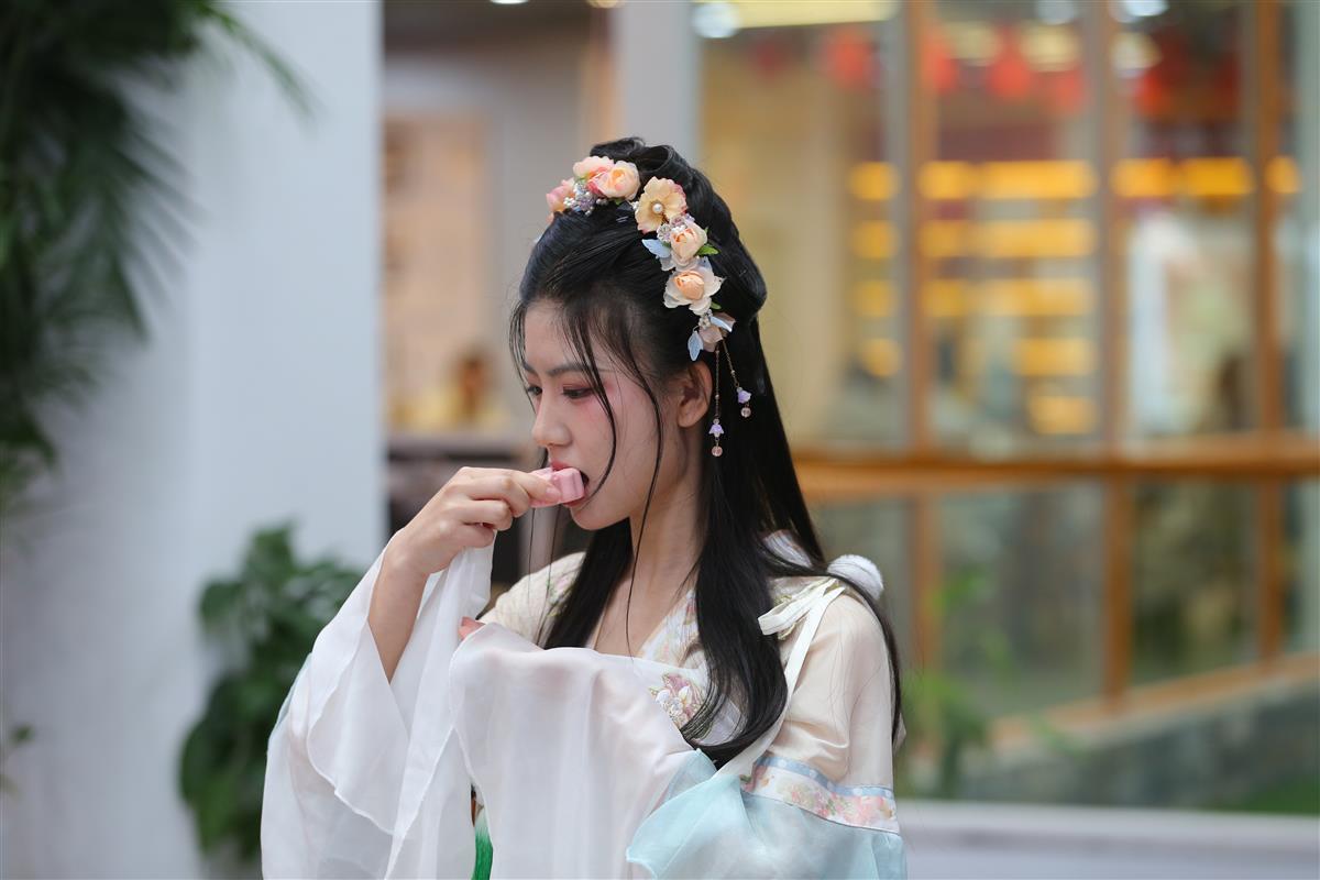 这次汉服体验让2022级物流管理专业的程佳瑶不住地感慨:“第一次穿汉服,体验真的非常好!我穿的宋制汉服,上面独特的刺绣十分精美,巧妙地反映出了宋代的礼仪文化特点。我感觉自己就像穿越到了宋朝,来了一场文化之旅,也来了一场春天的旅行。”