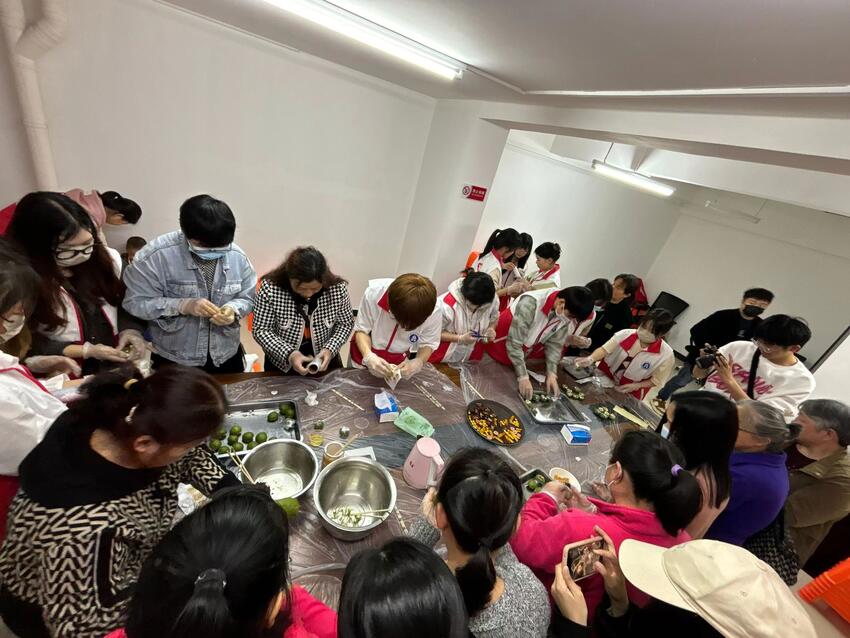 活动在介绍荆楚饮食文化和日常烹饪常识中拉开序幕,青年志愿者们为大家讲解如何烹饪出美味又健康的菜肴,接着开始进行青团和双皮奶制作教学。揉面、裹馅、搅拌……大家跟着老师的示范,巧指翻飞,一派热火朝天的景象。不一会儿,一个个圆墩墩的青团,及爽滑细腻的双皮奶呈现在眼前,大家相互展示,拍照留念,现场充满了欢声笑语。