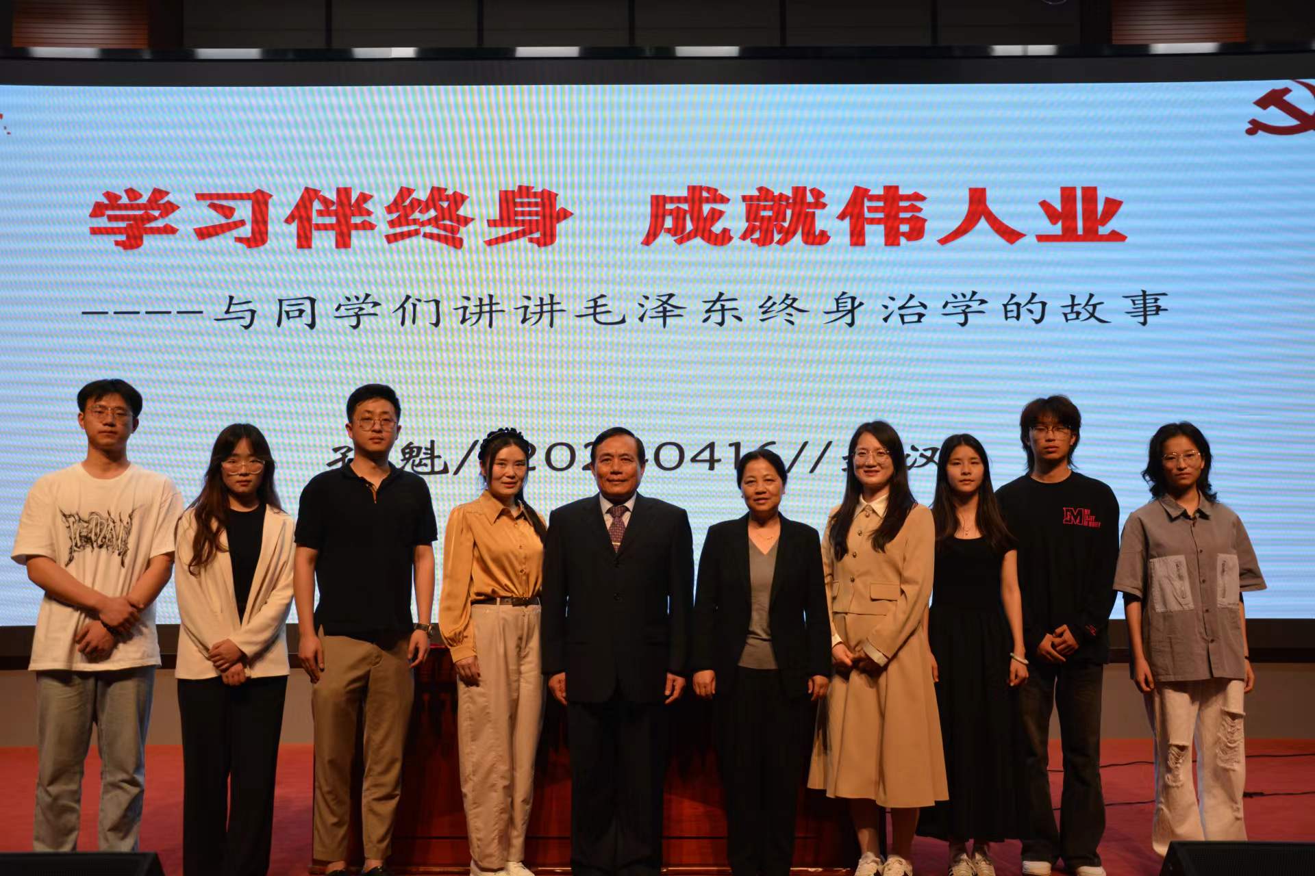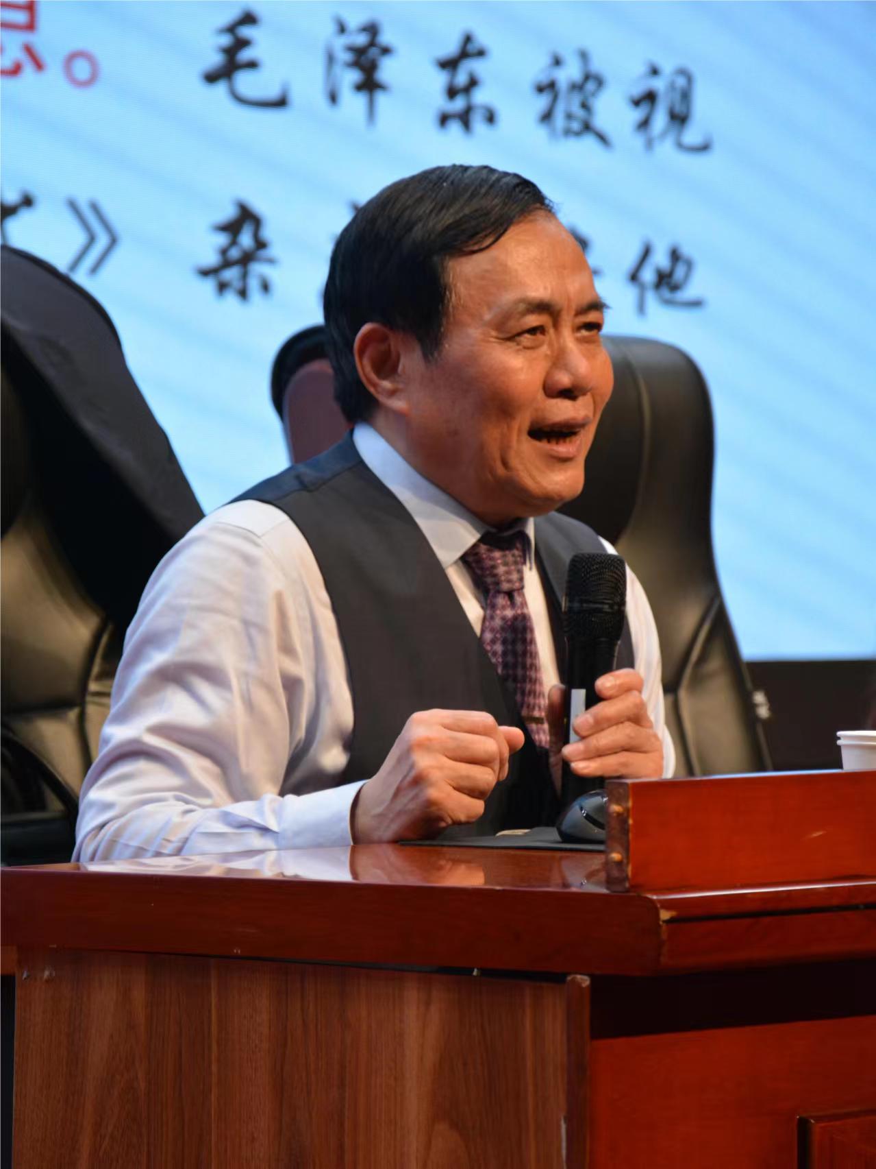 接下来,他从学习目的非常明确、学习范围非常宽广、学习方法非常科学、学习精神非常顽强、学习号召非常有力等方面,旁征博引、深入浅出地阐述了毛主席终身治学助伟业的宏伟志向、文化根基、至胜途径、精神丰碑和垂范引领,并结合自身几十年学习与践行实际,与大家交流“好好学习天天向上”的体会,最后以他写在毛泽东诞辰129周年的诗作《毛主席的赶考观》为结束语,鼓励大家学习毛主席的“赶考观”,终身学习和赶考,不断积蓄力量,为实现民族复兴伟大中国梦而努力写好各自美好人生。两个小时讲座,自始至终赢得现场听众的由衷共鸣和热烈掌声!
