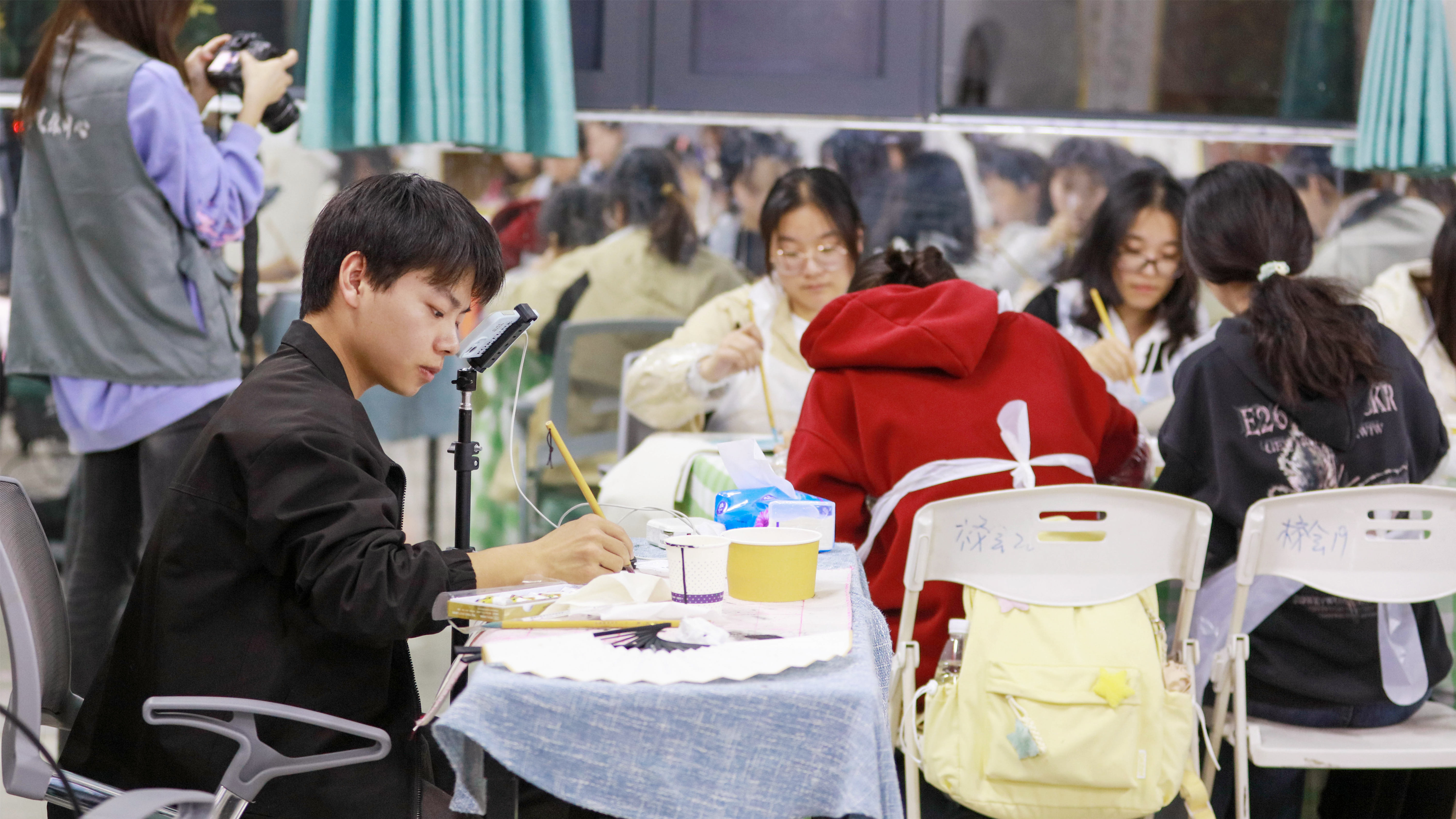 “小老师,这个远山该怎么画?”“学长,为什么我画成了黑色的一团,要怎么补救?”在自由创作环节,同学们有的在扇面上对着讲师的画作进行临摹;有的在手机上翻找自己喜欢的作品;有的自主发挥着想象力去创造专属自己的画作。结合身边的材料和个人喜好,一幅幅包含深意和创意的扇面画被细细描绘着。大家临摹画作时,胡劲也围着绘画桌对同学们进行360度的“环绕式”指导,观察同学们作品的意境以及不足之处,并给予相应的指导和帮助。来自旅游学院的王婉婷说出了大家的心声:“看老师操作和自己操作完全不是一回事!”