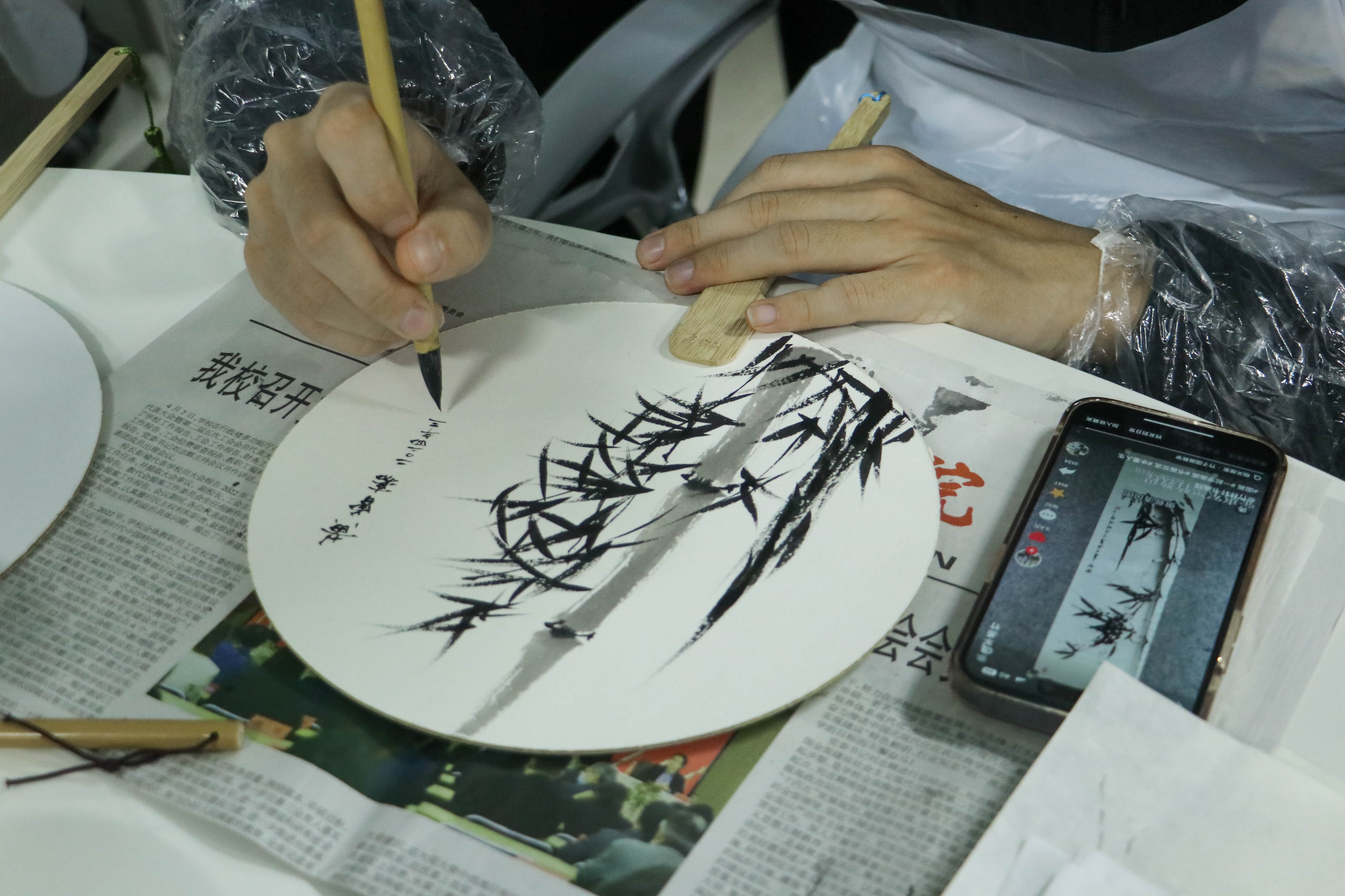 2023级物流管理专业的王雅慧同学在被讲师指导后开心地说:“之前就一直关注学校跟国学有关的课程,这次很高兴学到这么跟国画有关的技巧。我画的是桂花扇,我是喜欢黄色这样明艳自然的颜色,同时我每次看到淡黄的桂花就感觉很舒适和有力量。”2023级信息工程学院数据科学与大数据技术专业的黄曾嘉边画着墨竹边分享说:“竹叶婆娑,竹节分明,是自然之美的象征。同时画竹时的顿笔跟提笔,它跟日常写楷书比较接近。我经常练书法,这一点我比较熟悉。”
