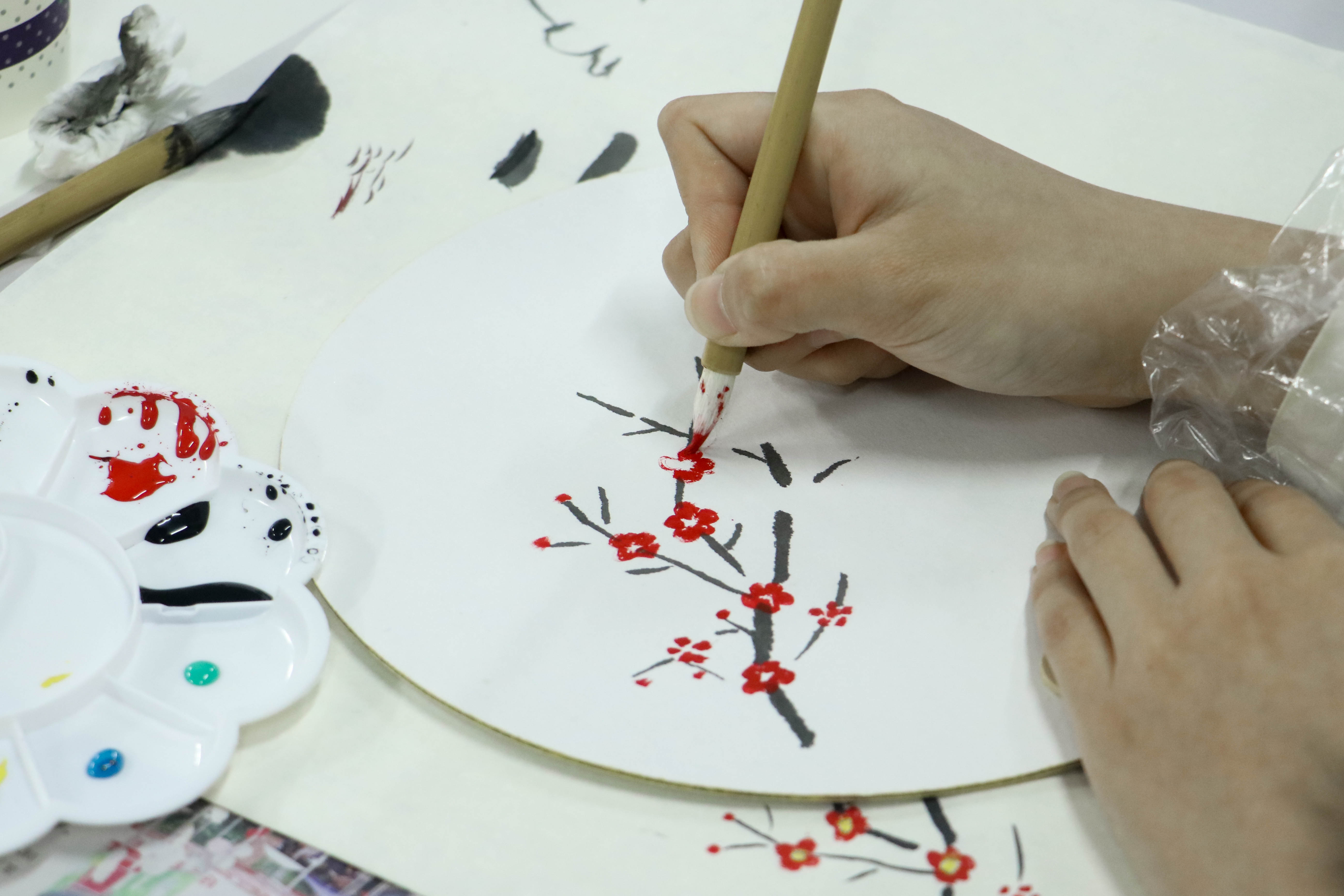 曙红、赭石、朱砂……桌面上散布着调色盘、墨汁和颜料,教室里的30多名同学手握毛笔,跟着艺术学院2021级动画三班的胡劲小讲师,在宣纸和扇面上细细地勾勒丹青。在这里,零基础的绘画小白也能打开国画的“七彩万花筒”,解密颜色叠加的n种秘方,画出各种富有意境的扇面画。