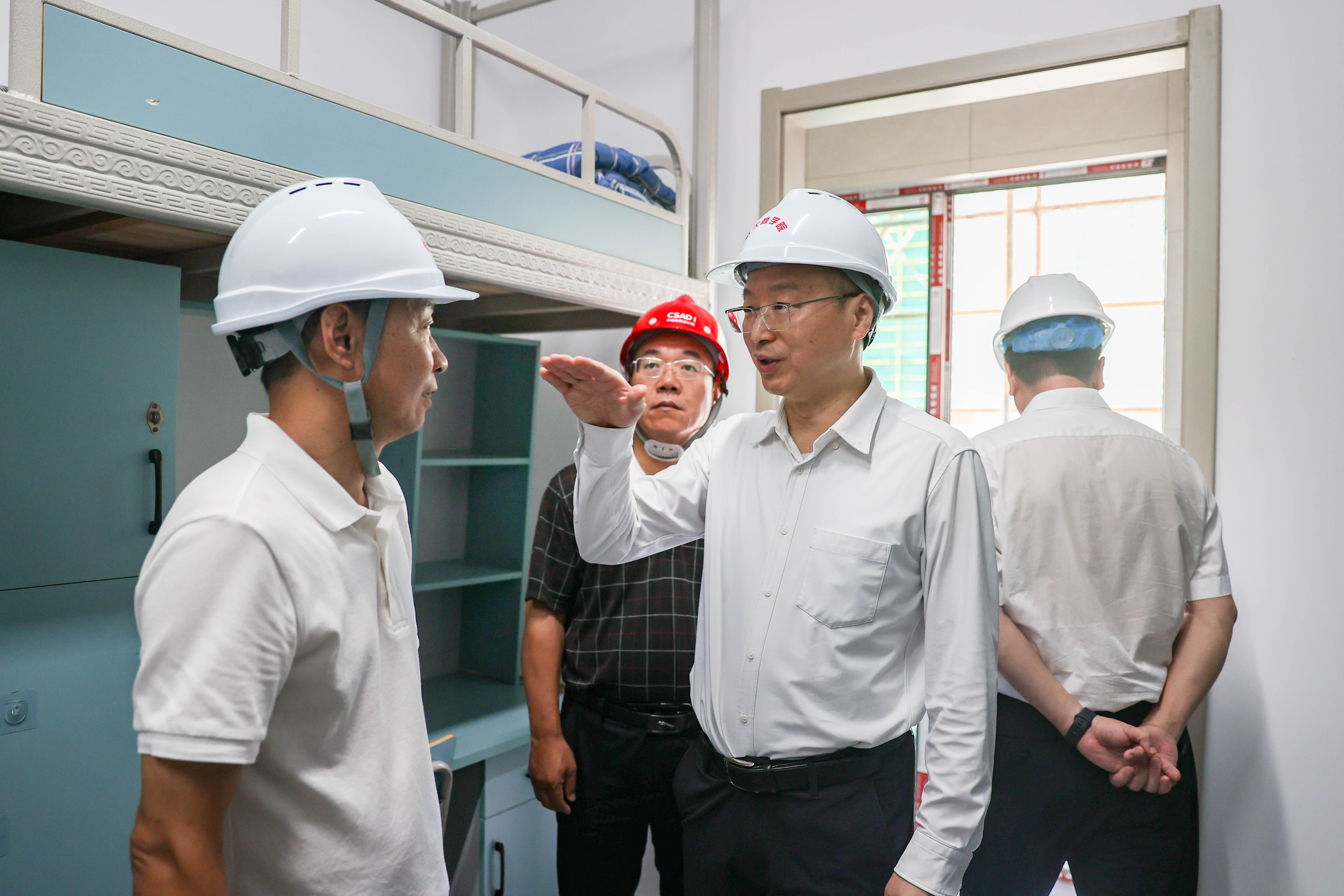 调研中,孟武康一行前往人才公寓、1号学生宿舍的施工现场、规范样板间进行考察。人才公寓单体建筑共地上3层,总建筑面积1820平方米,46套2人间,共计容纳92人;1号学生宿舍单体建筑地上12层,层高3.6米,总建筑面积14071平方米,共358套4人间,4套2人间(无障碍间),共计可容纳1440人。孟武康强调,建设单位要按照“总体规划,分步实施”的原则建设,着重保障建筑质量,确保施工安全。