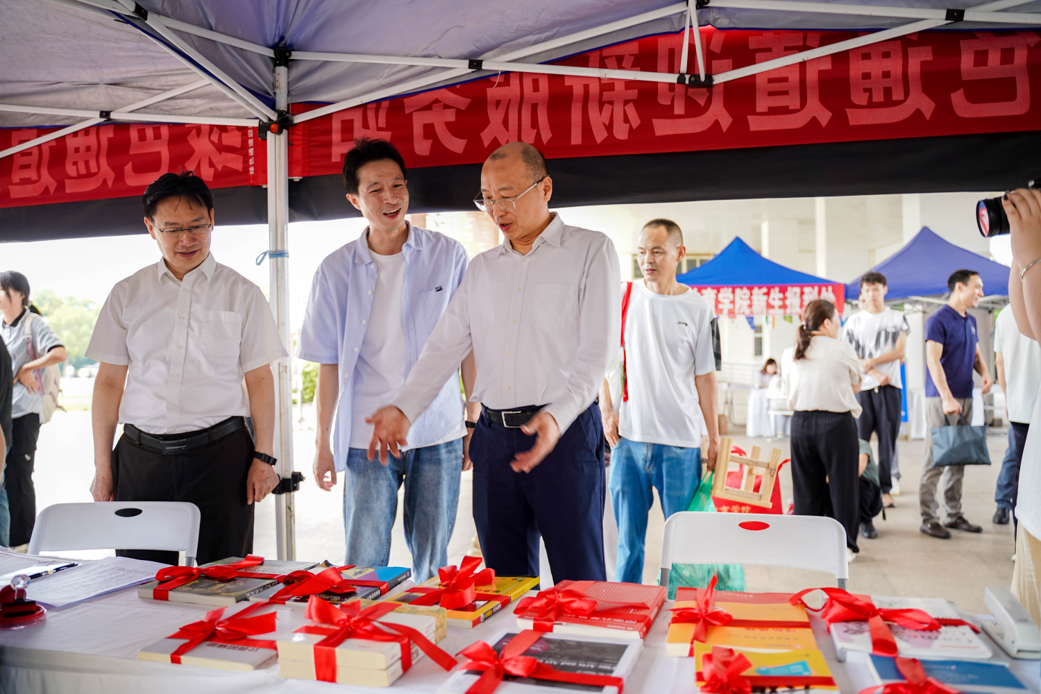 来自贵州的李先生是跟着自家孩子一起来学校报道的随行家长,看着孩子选好书,他专门拍了张照片发了条朋友圈:“本来跨省上大学还担心呢,结果一来学校就又是志愿者接,又是各种小活动小礼物的,领个开学大礼包都还能选本毕业生留下的书,一来学校就感受到各种温暖和祝福,这个学校来对了!姑娘在这我可以放心了!”