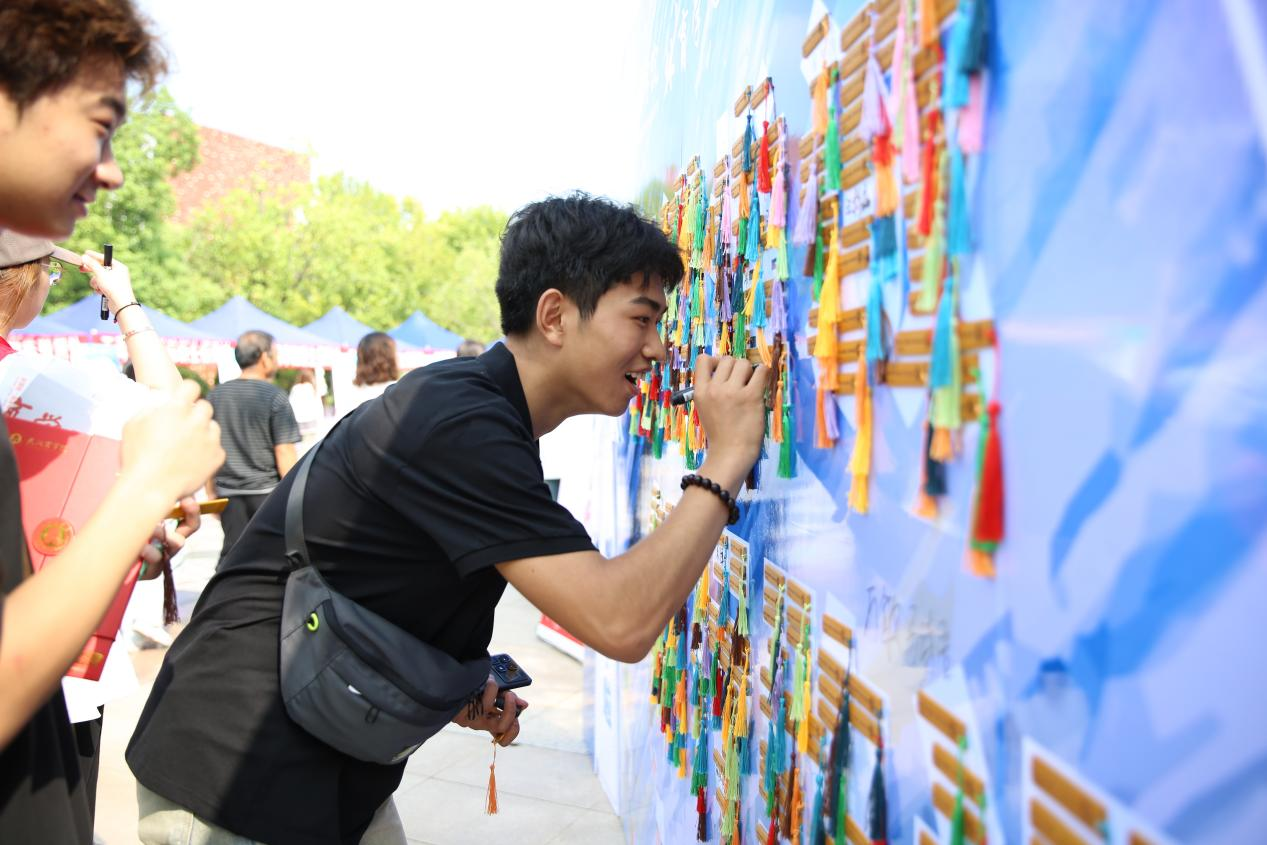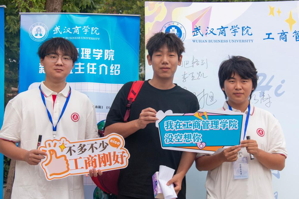 钥匙扣、书签、小风扇、笔记本……为了让新生们更好地感受到学院的温暖与热情,工商管理学院开启了一系列“花式迎新”——“不多不少,工商刚好”“我在工商没空想你”摆放在迎新站点前的俏皮活泼的标语,引得新生们纷纷拍照打卡;在学院特别设置的签名板前,新生们也陆续写下属于自己的大学寄语:“就要开启我的大学人生了,未来也要好好加油啊!”“下一站,大学!”“我们终会顶峰相见。”