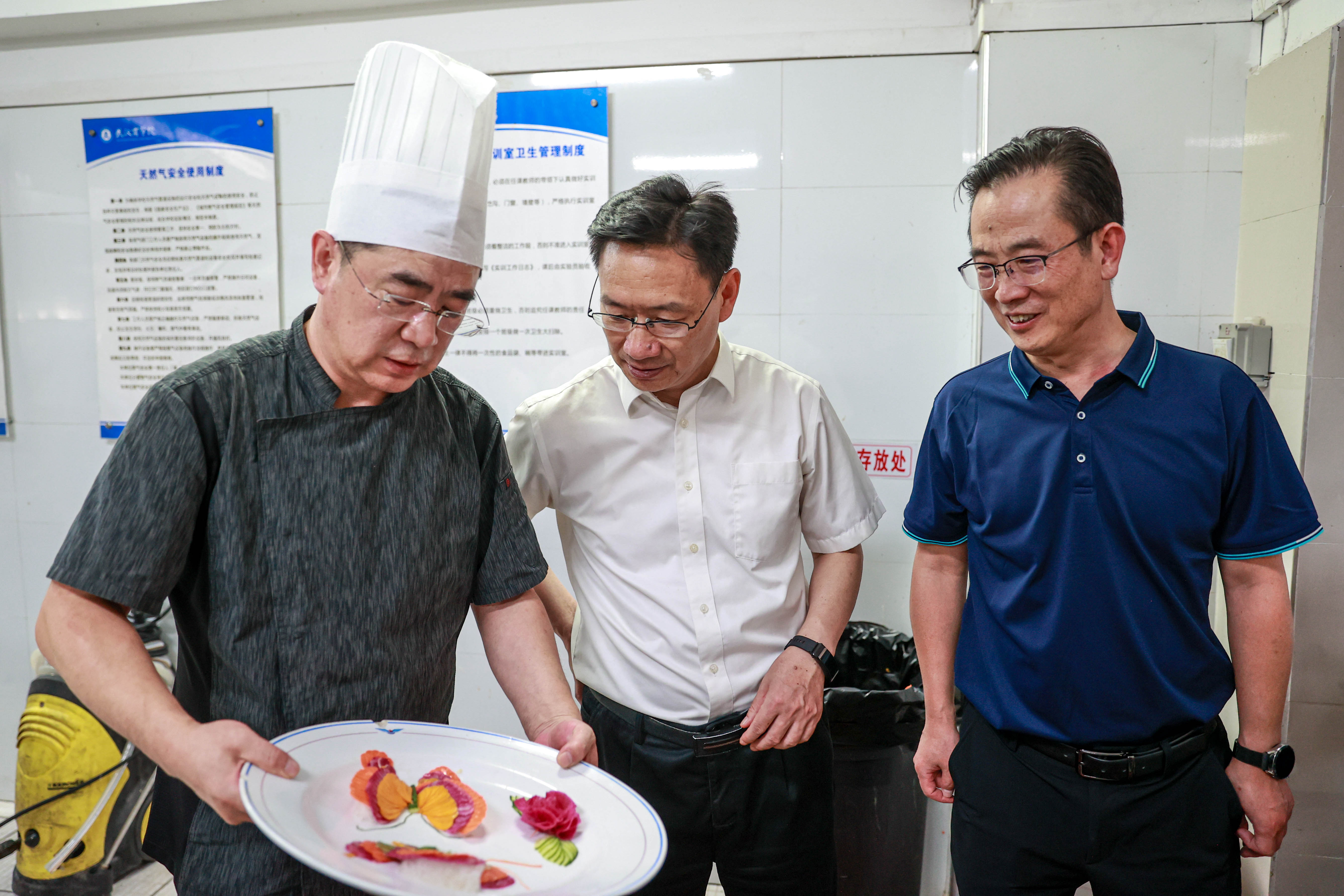 在食堂和食品科技学院实验室,彭瑜、孙步月一行重点检查了食品安全和实验室安全。彭瑜强调,食品安全关系到师生的身体健康,必须做到严格把关,同时要注重节能环保,减少浪费,他要求资产与后勤管理处要加强监管,确保食品来源可靠,加工过程规范,实验室操作安全。在食品科技学院实验室的巡查中,彭瑜进入了冷拼选修课实验室。他仔细观看了学生们的作品,对学生们富有创意的冷拼作品表示高度赞赏。彭瑜指出,学生们在课堂中能够运用自己的思考,将所学知识与实践相结合,这是非常难得的。他鼓励学生们继续保持这种创新精神,不断提升自己的实践能力。