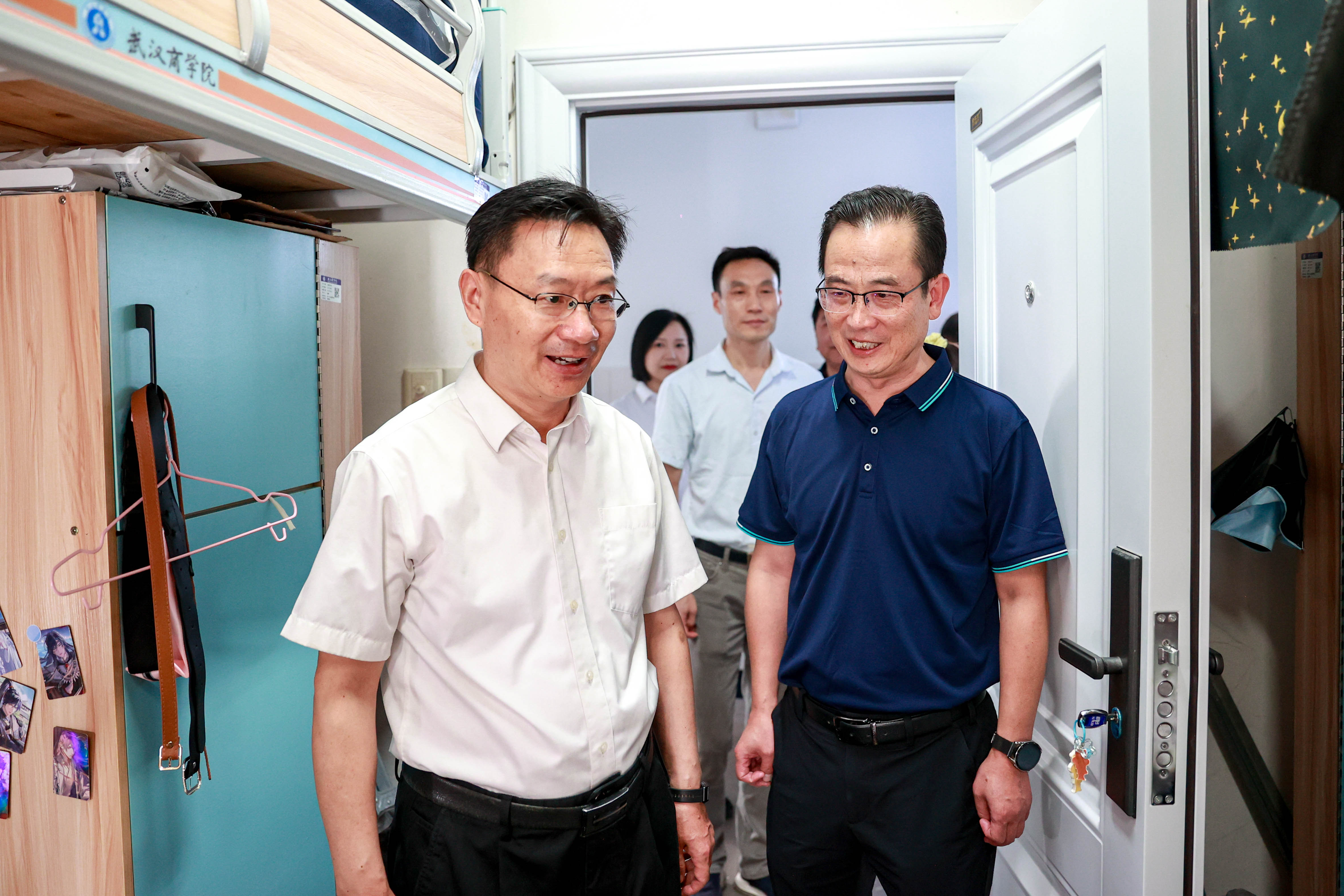 “宿舍是学生学习生活的重要场所,必须确保安全无虞。”巡检的第一站是学生宿舍楼,在这里,彭瑜、孙步月一行详细询问了解宿舍管理情况,查看了消防设施、安全通道以及宿舍卫生状况。彭瑜亲切地与学生们交流,询问他们的籍贯、国庆是否回家以及对学校宿舍和基础设施的评价。他认真听取了学生的意见和建议,并表示将持续改善宿舍条件,为学生们提供一个更加安全、舒适的居住环境。