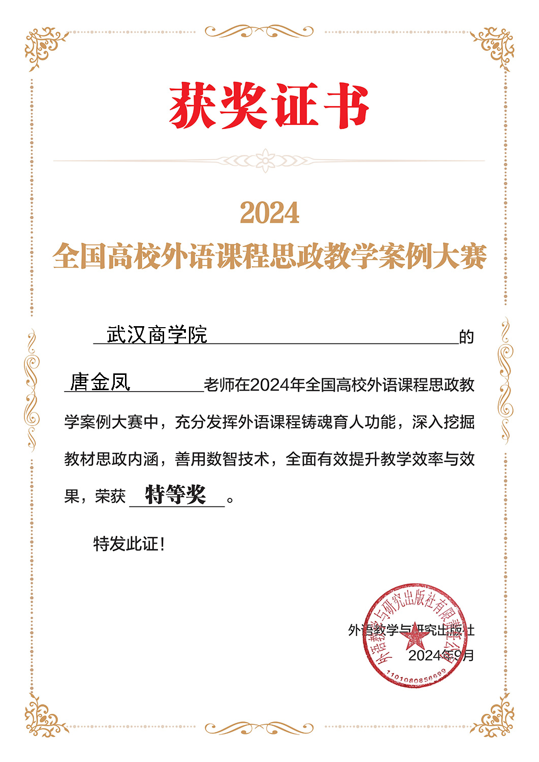 本网讯 近日,2024年全国高校外语课程思政教学案例大赛圆满落幕,外国语学院翻译系教师唐金凤荣获特等奖,彭梦佳荣获一等奖,黎珂荣获三等奖。这是pg电子官网深入贯彻立德树人根本任务,全面落实“三进”工作,推进数智化人才培养改革取得的显著成果。