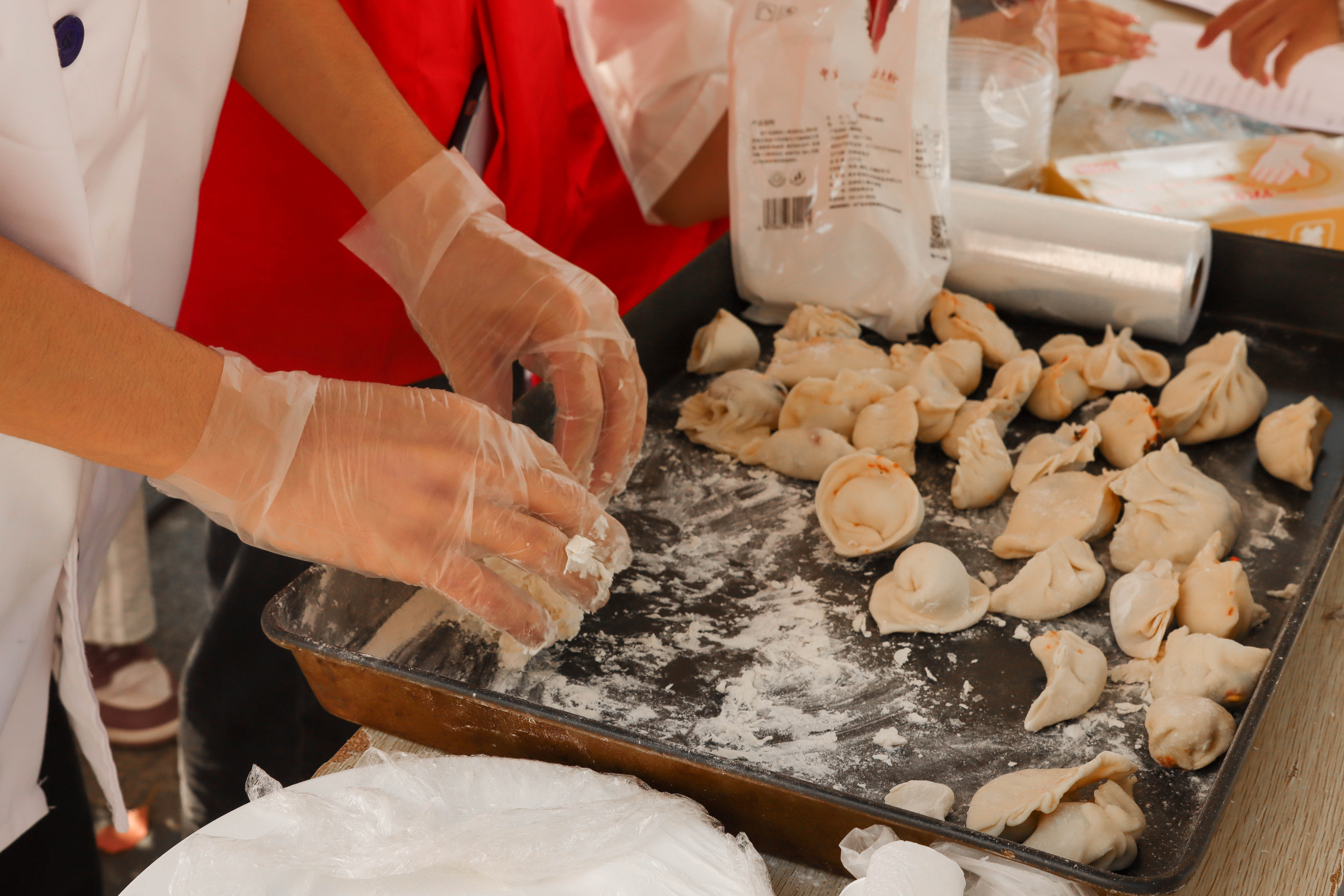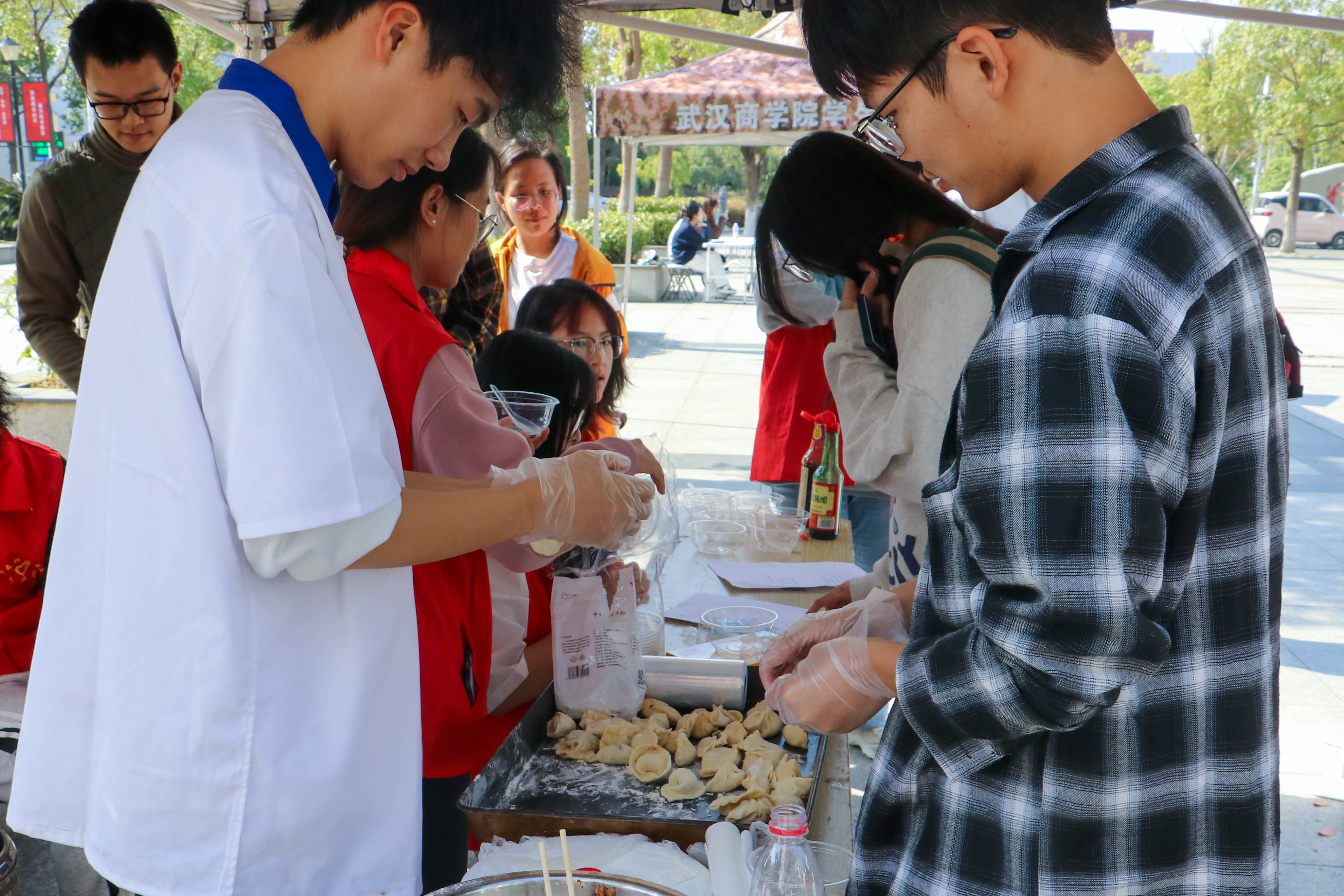将面团擀成薄片、在饺子中央放入适量的馅料、对折再进行封口。活动现场十分火热,在志愿者们热心指导下,同学们带上手套学习包饺子,有斜单边包、花边包或者多种方式结合,最后形成了各具特色的冠顶饺、双合饺子和四喜饺子等。“在学习过程中,没想到饺子有这么多的包法和花样,这次体验感觉太棒了!”2023级物流管理二班的陆静怡分享说。这些饺子的馅料由猪肉、玉米、香菇、冬笋和木耳组成,精心调配后色滋味鲜美,口感十分丰富。