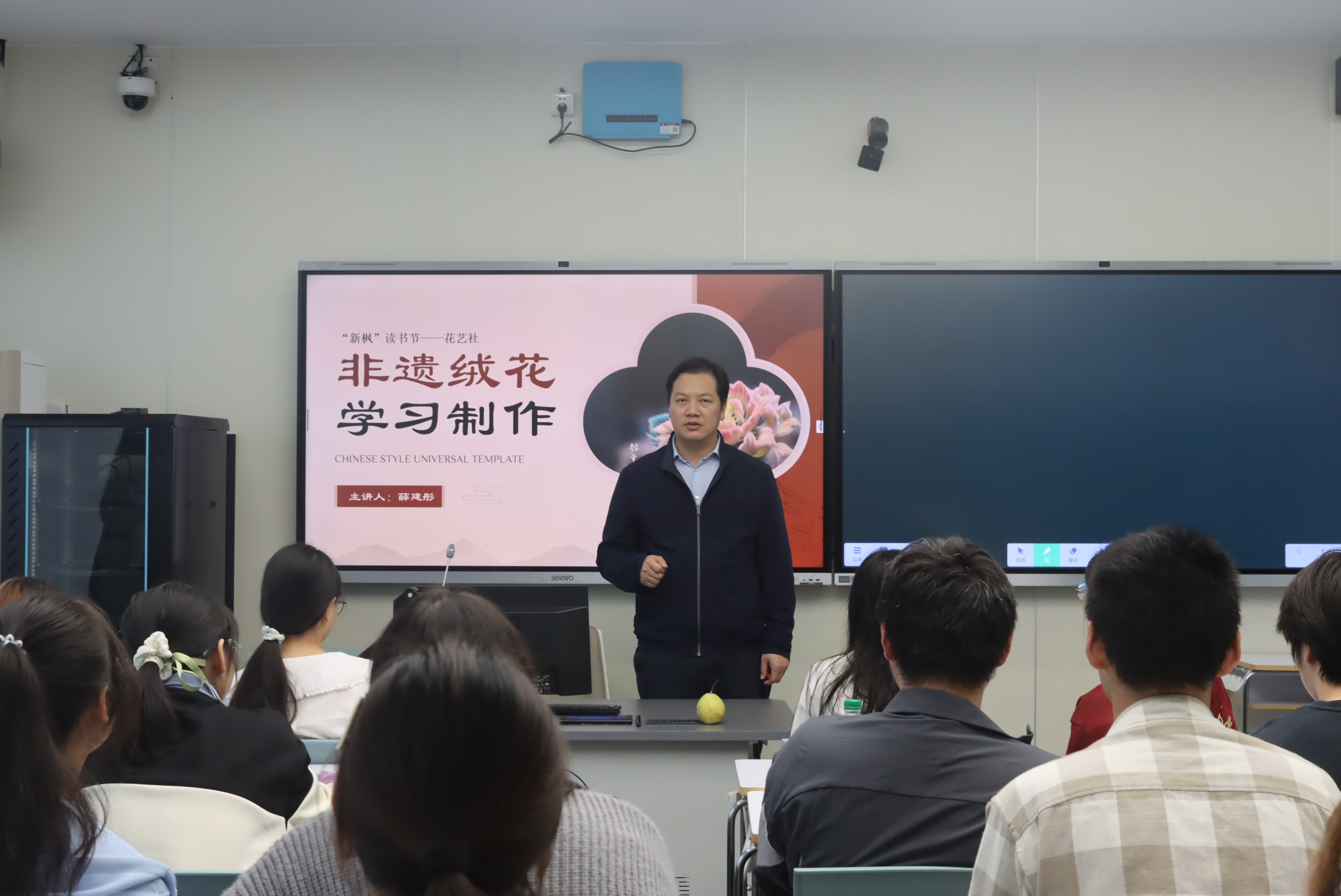 活动伊始,国际教育学院院长李平发表讲话。李平以近期备受瞩目的非遗文化传承人李子柒的回归为切入点,阐述了非物质文化遗产在当代社会的重要性及其对我们每个人的深远意义。同时他表示,花艺社团本次的活动富有新意,鼓励他们也可以走出课堂,在校园内外推广绒花这一独具魅力的非遗项目,让更多人了解这份珍贵的文化遗产。
