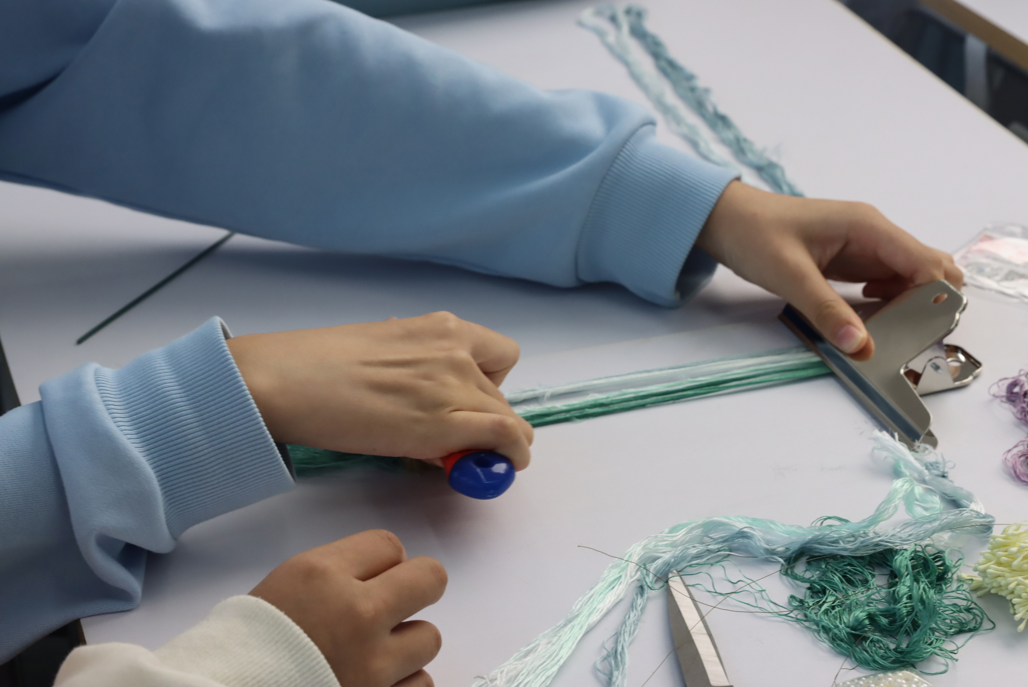 首先以八根绒线为一组,将绒线整齐地串在横杆上,跟随着薛建彤的讲解教学,大家先将顺滑的绒线除去杂毛使其变得光鲜,然后穿上铜丝,2023级机器人工程专业李丽薇选择的是蓝绿色渐变绒线,一折一弯,一剪一按,精细地修剪后,熨平成花瓣,用镊子将不同色彩、规格地花瓣进行造型组合,制成立体绒花,最后用白乳胶粘上水晶珠、花蕊等装饰,一朵精致美丽的绒花便绽放在指尖。她分享说:“很开心能参加今天这次活动,我进一步感受到了非遗文化的魅力,同时我觉得制作绒花要有耐心和时间,不然一朵都很难做出来。”